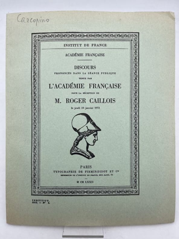 Paris Firmin-Didot 1972 1 vol. broché in-4, broché, couverture verte, 45 pp. Édition originale de cet hommage à Jérôme Carcopino, suivi de la réponse de René Huygue. Couverture très légèrement brunie en bordure.