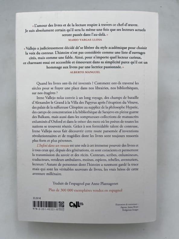<meta charset="utf-8"><span data-mce-fragment="1">« L’amour des livres et de la lecture respire à travers ce chef-d’œuvre. Je suis absolument certain qu’il sera lu même une fois que ses lecteurs actuels seront passés dans l’au-delà. »</span><br data-mce-fragment="1"><strong data-mce-fragment="1">Mario Vargas Llosa</strong><br data-mce-fragment="1"><br data-mce-fragment="1"><span data-mce-fragment="1">« Vallejo a judicieusement décidé de se libérer du style académique pour choisir la voix du conteur. L’histoire n’est pas considérée comme une liste d’ouvrages cités, mais comme une fable. Ainsi, pour n’importe quel lecteur curieux, ce charmant essai est accessible et émouvant dans sa simplicité parce qu’il est un hommage aux livres par une lectrice passionnée. »</span><br data-mce-fragment="1"><strong data-mce-fragment="1">Alberto Manguel</strong><span data-mce-fragment="1"></span><br data-mce-fragment="1"><br data-mce-fragment="1"><span data-mce-fragment="1">Quand les livres ont-ils été inventés ? Comment ont-ils traversé les siècles pour se frayer une place dans nos librairies, nos bibliothèques, sur nos étagères ?</span><br data-mce-fragment="1"><span data-mce-fragment="1">Irene Vallejo nous convie à un long voyage, des champs de bataille d’Alexandre le Grand à la Villa des Papyrus après l’éruption du Vésuve, des palais de la sulfureuse Cléopâtre au supplice de la philosophe Hypatie, des camps de concentration à la bibliothèque de Sarajevo en pleine guerre des Balkans, mais aussi dans les somptueuses collections de manuscrits enluminés d’Oxford et dans le trésor des mots où les poètes de toutes les nations se trouvent réunis. Grâce à son formidable talent de conteuse, Irene Vallejo nous fait découvrir cette route parsemée d’inventions révolutionnaires et de tragédies dont les livres sont toujours ressortis plus forts et plus pérennes.</span><br data-mce-fragment="1"><em data-mce-fragment="1">L’Infini dans un roseau</em><span data-mce-fragment="1">est une ode à cet immense pouvoir des livres et à tous ceux qui, depuis des générations, en sont conscients et permettent la transmission du savoir et des récits. Conteurs, scribes, enlumineurs, traducteurs, vendeurs ambulants, moines, espions, rebelles, aventuriers, lecteurs ! Autant de personnes dont l’histoire a rarement gardé la trace mais qui sont les véritables sauveurs de livres, les vrais héros de cette aventure millénaire.</span> Paris, 2021 Les Belles Lettres 538 p., broché. 15,5 x 22,6
