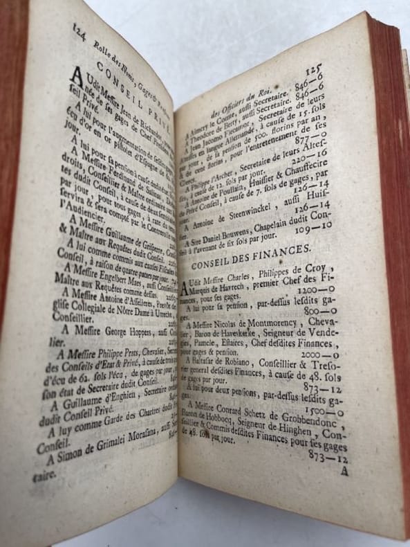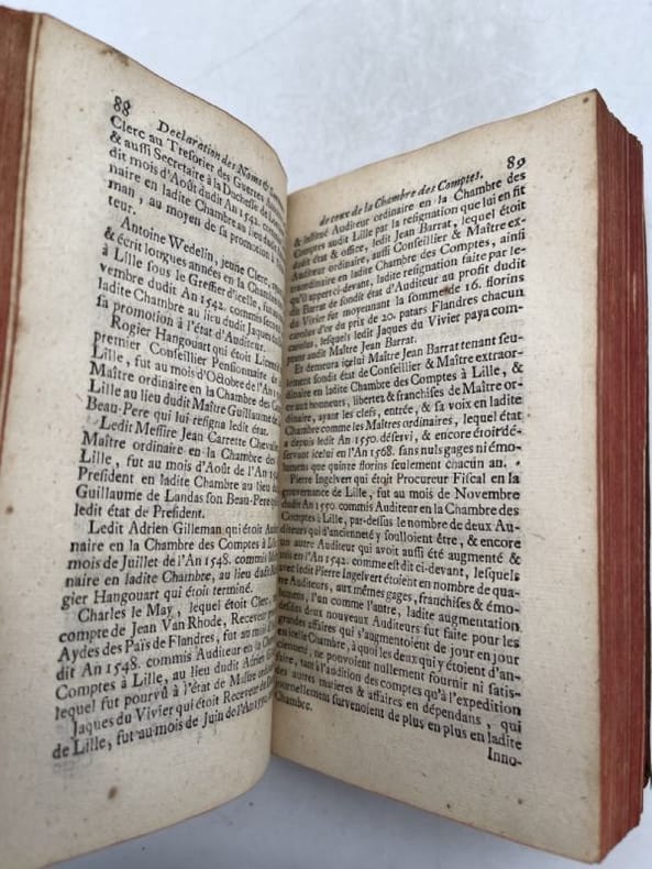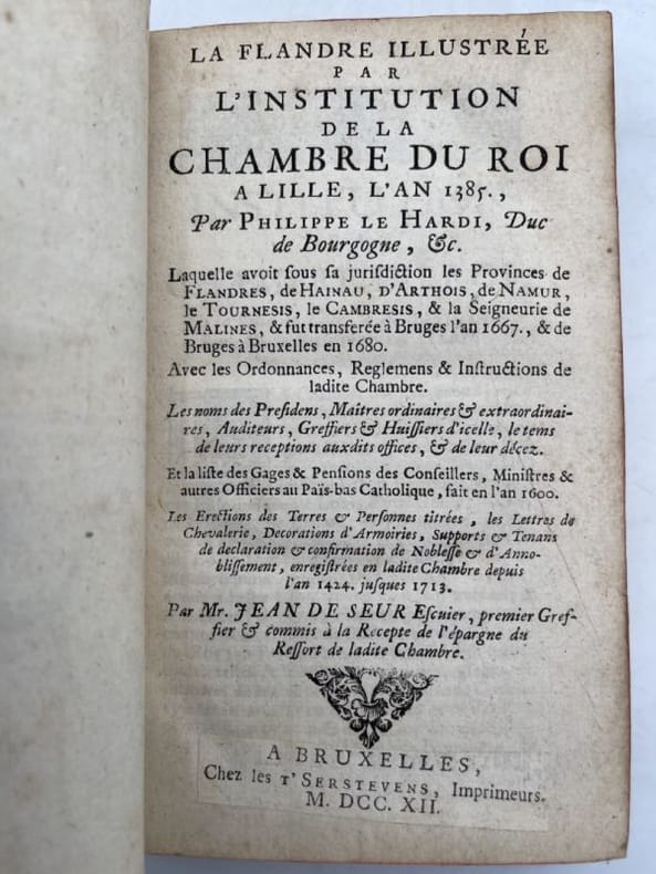 T'Serstevenss A Bruxelles, chez T'Sestevens, 1712. In-12 relié plein veau blond de l'époque. Dos à nerfs ornés, fleurons dorés, pièce de titre. Roulette sur les coupes. Tranches rouges. 2ffblancs, titre, 272 pages + 8 ff non chiffrés pour la table et un ffblanc. ''Laquelle avait sous sa juridiction les provinces de Flandres, de Hainau, d'Arthois, de Namur, le Tournesis, le Cambresis, & la seigneurie de Malines, & fut transferée à Bruges l'an 1667, et de Bruges à Bruxelles en 1680"... Mors supérieur fragile. Bon exemplaire.