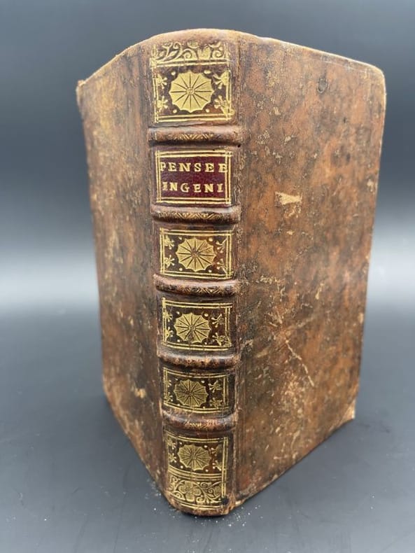 Chez la Veuve Delaulne Paris, Chez la Veuve Delaulne, 1734. Petit In-12 relié plein veau brun moucheté d'époque, dos à nerfs orné de fleurons dorés et pièce de titre rouge, roulettes dorées sur coupes,Tranches rouges . Gardes marbrées, 1 ff. blanc, titre, 4ff + 502 pages avec manchettes + 2 ff, 1 ff. blanc. Nouvelle édition augmentée. Les "pensées ingénieuses des Anciens et des Modernes", dont la première édition date de 1689, est une savante anthologie d'esprit, de la main du père Dominique BONHOURS, jésuite renommé et chantre du classicisme, confrontant la Lettre des Anciens à l'Esprit des Modernes, que notre auteur s'était déjà essayé de façonner dans son illustre ouvrage "La Manière de bien penser", le tout composant un miroir des traits d'esprit de la culture littéraire et morale du XVIIe et XVIIIe siècle. Épidermures, coins émoussés, coiffes et nerfs légèrement frottés. Intérieur bien préservé, très peu de rousseurs, impression encore parfaitement lisible. Néanmoins bon exemplaire.