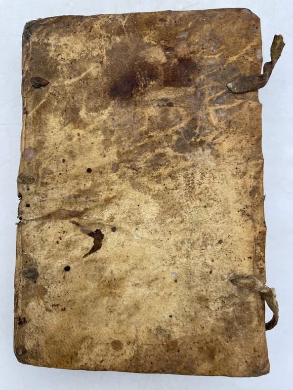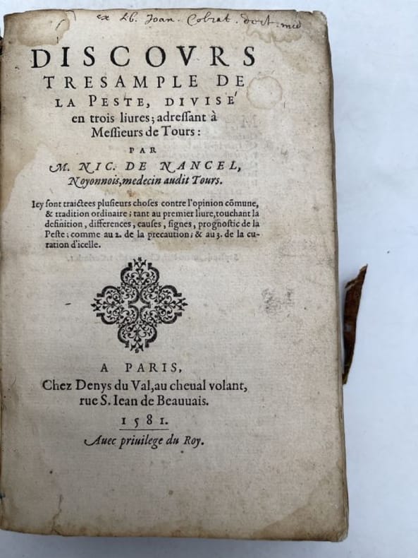 Denys du Val A Paris, Chez Denys du Val, 1581. In-8 relié vélin à recouvrement noué par lacets. 2 ff. blancs, 357 pages (dont le titre), 7 ff. non chiffrés, 1 ff. blanc. "Icy sont traictées plusieurs choses conter l'opinion comune, & tradition ordinaire ; tant au premier livre, touchant la définition, differences, sauses, signes, prognostic de la Peste ; comme au 2. de la precaution ; & au 3. de la curation d'icelle". Nicolas de Nancel choisit de publier en français, pour être compris du plus grand nombre. Il aborde la définition, les causes, les signes, le pronostic, les précautions et le traitement de la peste et se termine par un « Avertissement particulier à Messieurs de Tours, touchant la police & règlement quon doit garder & tenir en temps de peste », ce qui en fait également un document dhistoire des mesures sanitaires et urbaines. Nicolas de Nancel (1539-1610) exerça à Tours en tant que docteur en médecine et était un humaniste reconnu. Ce traité est spécifiquement adressé aux magistrats de la ville de Tours ; la proximité de notre auteur avec la réalité des maux qu'il décrit donne au texte un caractère foncièrement pratique et concret. Le sujet - la peste - et sa datation (1581) en font un témoin historique des mentalités, des pratiques médicales et des politiques sanitaires de la fin du XVIe siècle. La seconde partie, se focalise quant à elle bien plus sur les remèdes et conseils, et cite en exemple des méthodes comme : "Des médicaments extraordinaires, & des pierres précieuses & ferme espoir en Dieu : je scay qu'aucuns non contents de ces remedes ordinaires & salubres, en ont voulu esprouver d'autres totalement étranges ; comme de mettre un crapaut en cendre, & l'appliquer en pouldre, ou en forme d'onguent, sur la region du coeur, autres, de prendre arsenic, ou sublimé ou reaga...". Le velin est taché avec quelques petits trous, mouillures sur les pages. Édition originale peu courante. En l'état.