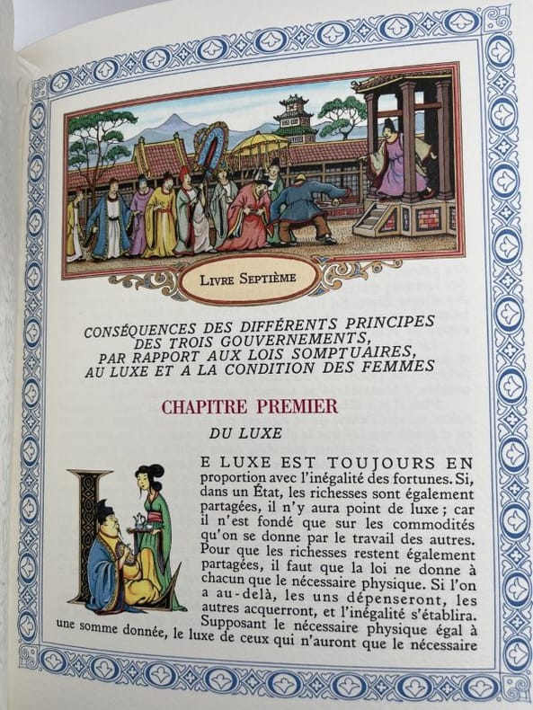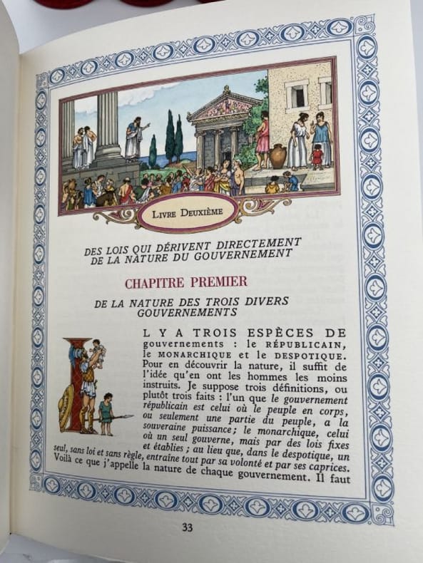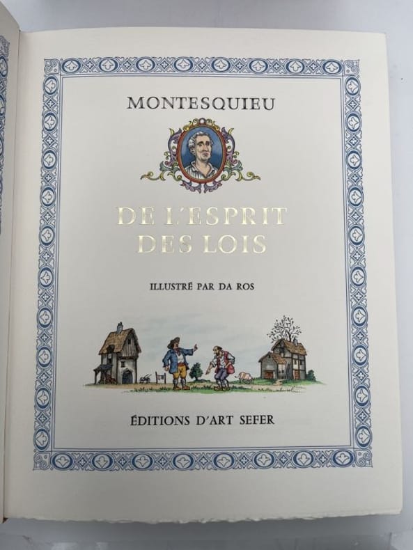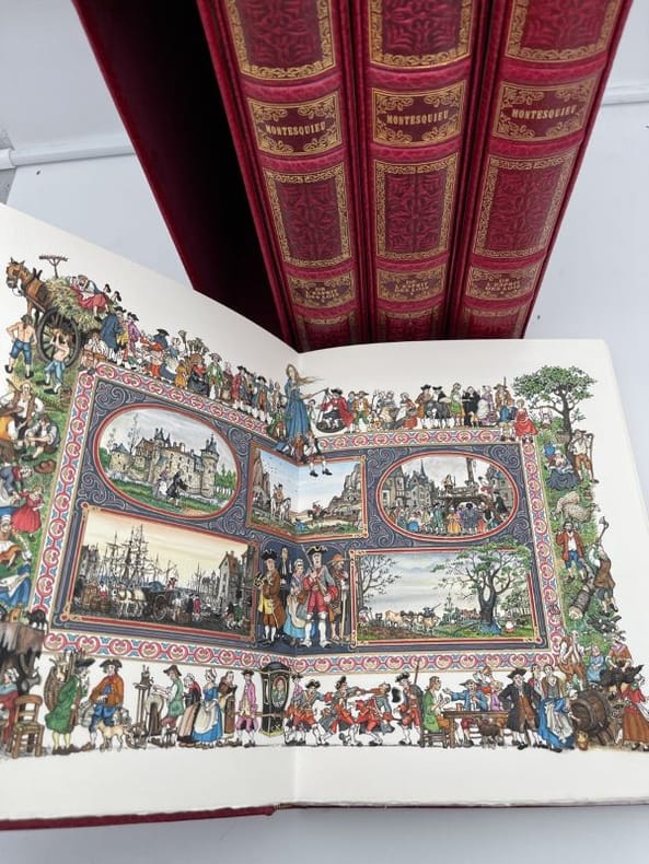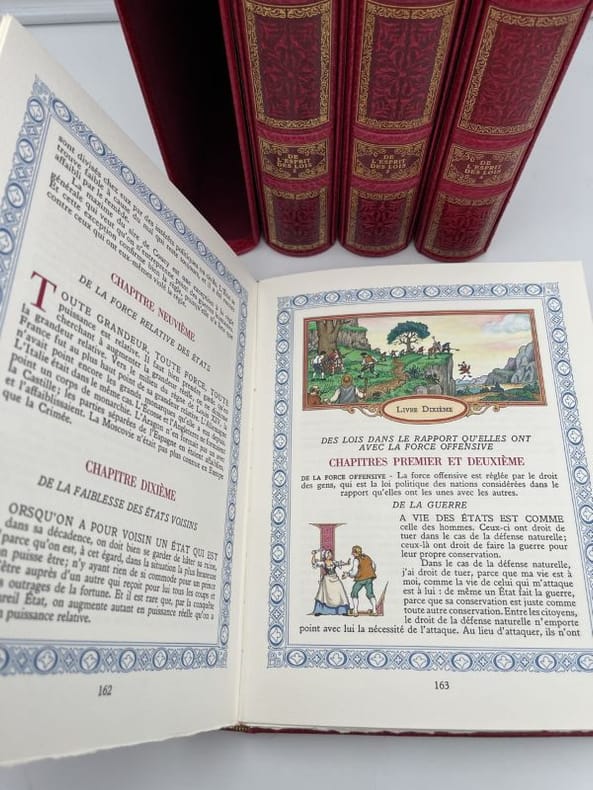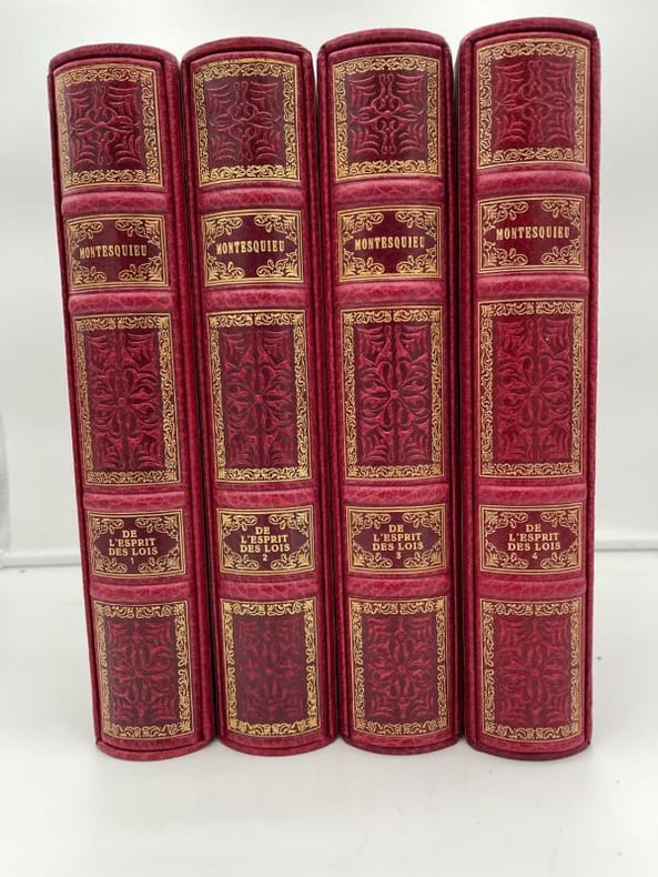 Paris DALIBON, LIBRAIRE, de l' imprimerie de L.-T. CELLOT 1822 huit volumes in-8°, XLVI 429, 442, 472, 526, 615, 456, 566 et 487 pp. Reliure de l' époque en demi-basane maroquinée vert, dos lisses ornés du titre, de tomaison, de guirlande, de filets et de fers romantiques doré.e.s. (volumes légèrement frottés, rousseurs). Portrait-frontispice de Montesquieu d'après Devéria gravé sur métal par H. C. Müller. Un fac-similé de lettre en début du tome premier. Tome I : Grandeur des Romains ; Tomes II, III et IV : Esprit des Lois ; : Tome V : Défense de l'Esprit des Lois ; Tome VI : Lettres Persanes ; Tome VII : Oeuvres diverses ; Tome VIII : Commentaire sur l'Esprit des Lois. Recherché.