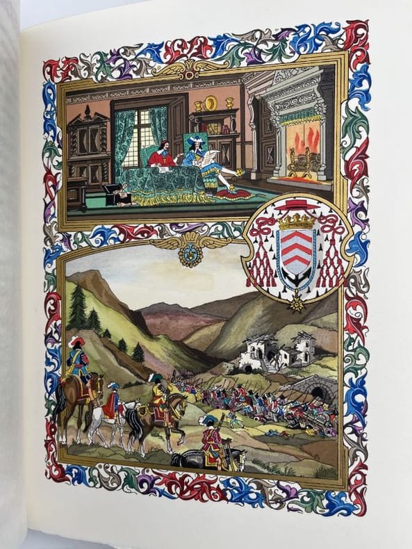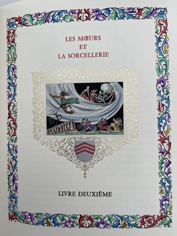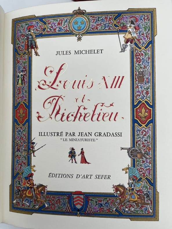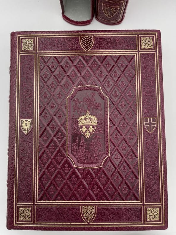 Editions d'art Sefer Nice, Éditions dArt Sefer, 1983. 2 volumes In-4 carrés pleine Reliure d'éditeur en basane maroquinée rouge grenat, richement ornée d'un décor estampé à froid, filets dorés d'encadrement et divers motifs, tête dorée, étui gansé de cuir. 221 + 206 pages. Illustrations en couleurs de Jean Gradassi, dont une double planche,12 hors-texte à pleine page sous serpente, 8 illustrations dans le texte. Tirage à 1700 exemplaires sur Vélin d'Arches filigrané Arches-Sefer. Complet de son certificat d'authenticité. Exemplaire en parfait état et complet de son carton d'emballage d'origine.