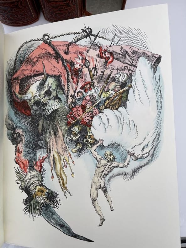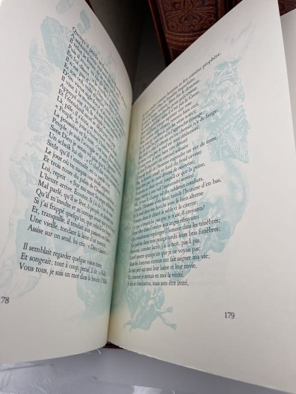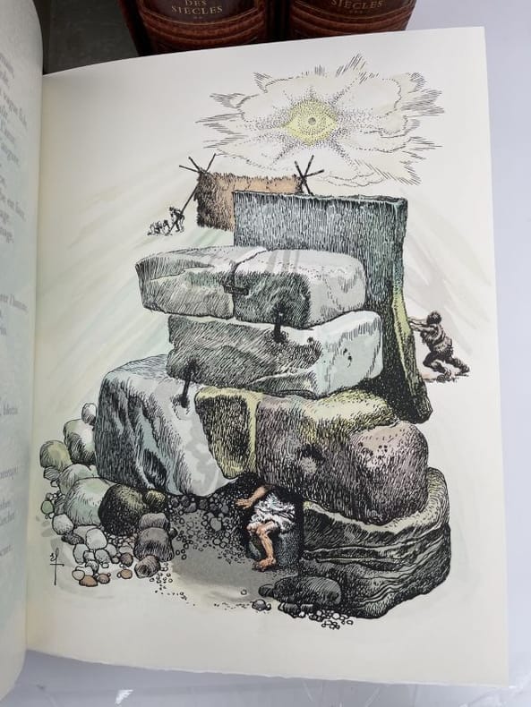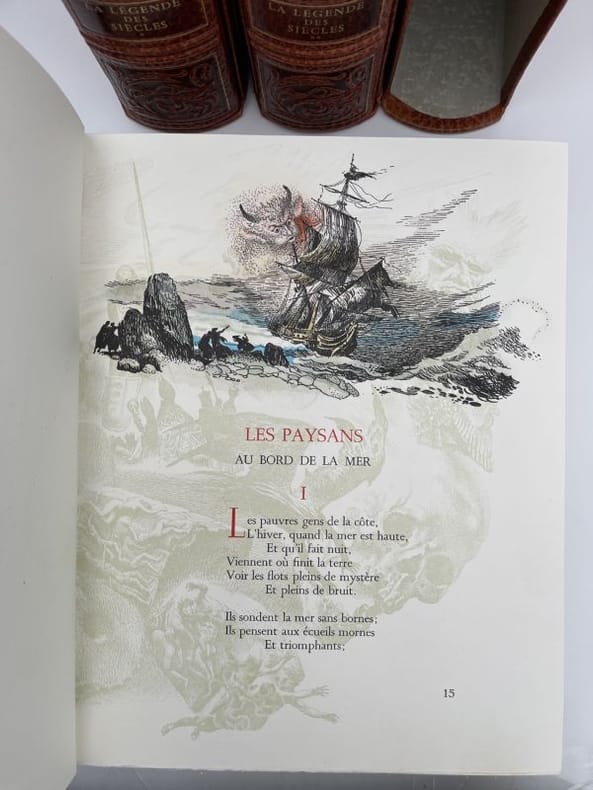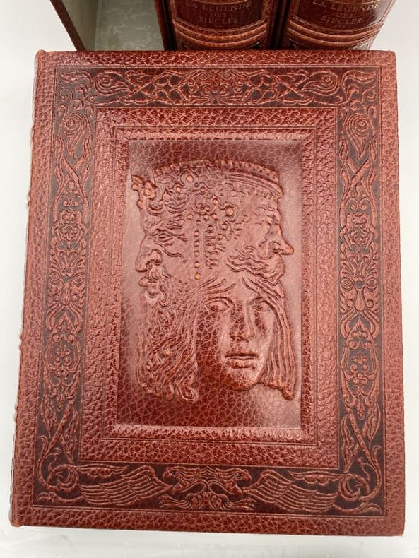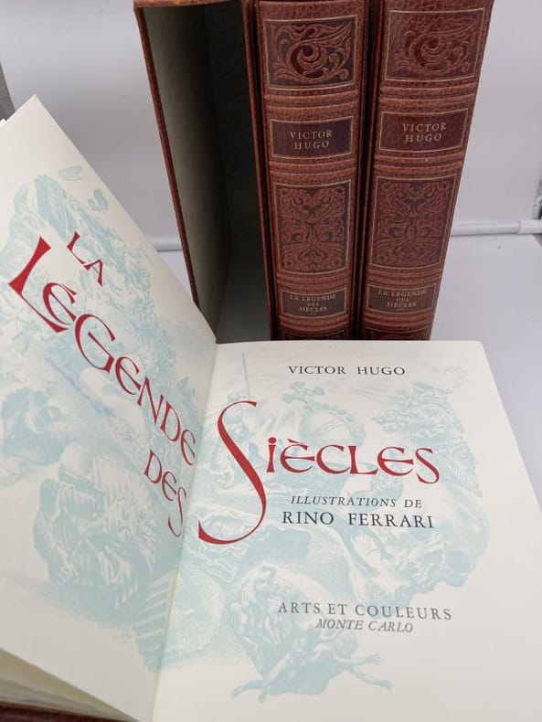 Editions Art et couleurs Monte-Carlo, Editions Art et Couleurs, 1976. 3 forts volumes grands In-4 reliure éditeur pleine basane havane, plat estampé à froid, dos à nerfs avec pièces de tomaison, tête dorée, Gardes de tissu moiré, sous étui gansé de cuir. 359-(5) pp., 338-(6) pp. et 331-(7) pp. Illustré en couleurs par Rino Ferrari. Tirage à 1680 exemplaires numérotés sur vélin de Lana filigranés Sefer, Très bon état