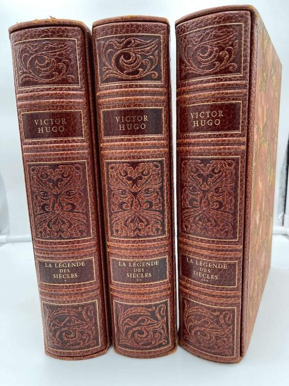 Paris, Alphonse Lemerre, 1875, 1882, 1887. 4 volumes petits in-12 dans une reliure postérieure en demi-chagrin à coins au dos lisse orné de fleurons, et filets d'encadrement dorés. Tranche supérieure dorée. Couverture et dos conservés. Faux-titre et titre, 421 pp, 1 f. d'achevé d'imprimer, 1 f. blanc, faux-titre, et titre, xiii, 279 pp, 1 f d'achevé d'imprimer. Faux-titre, et titre, 334 pp, 1 f. d'achevé d'imprimé, Faux-titre et titre, 1 f. blanc, 315 pp, 1 f. d'achevé d'imprimer. Illustré d'un buste de Victor Hugo de Schoenewerk en frontispice en deux états, l'un en noir et l'autre en sanguine Exemplaire sur papier de chine non justifiés. Frottements aux mors, sur 1 coiffe et 2 coins, sinon bel état sans rousseurs.