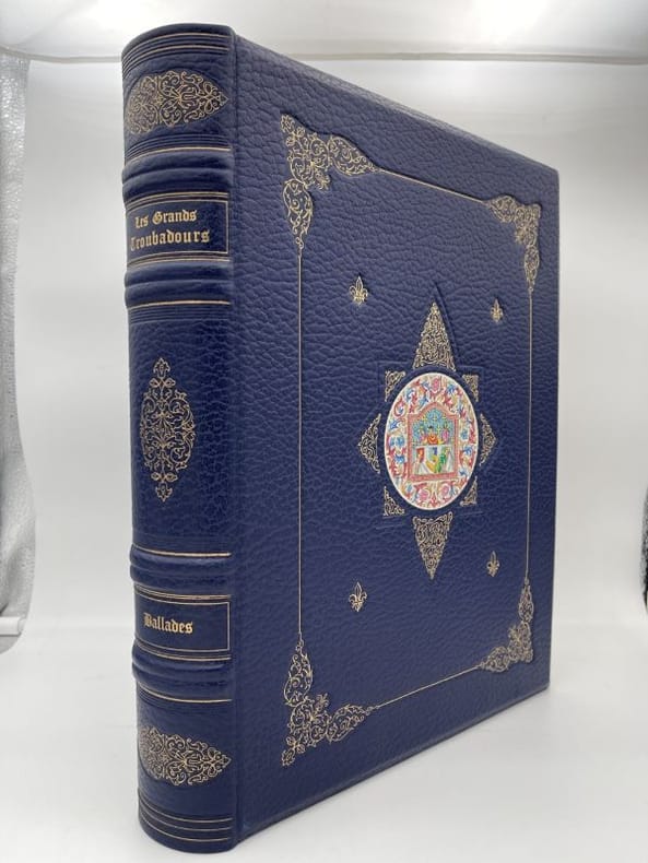 Nice Editions Sefer 1981 Grand in-4, bradel vélin orné sur le premier plat d'une composition imprimée en couleurs, dos portant le titre de l'ouvrage imprimé en bleu et noir sur un fond de motifs floraux dorés; doublures et gardes de soie moirée beige foncé, non rogné. Etui (reliure de l'éditeur).Cette belle édition rend hommage aux plus grands troubadours du XIIe siècle du midi de la France: Bernard de Ventadour, Bertran de Born, Guilhem de Cabestan, Cercamon le Gascon, Guillaume IX d'Aquitaine, Peire Vidal et Jaufré Rudel de Blaye. Elle constitue l'édition originale de la traduction de Joseph Pardo et est illustrée par Ansaldi de 16 planches en couleurs hors texte (dont une sur double page), reproduites en sérigraphie et rehaussées au pochoir; de plus, chaque page est ornée d'un encadrement en couleurs dessiné par l'illustrateur et rehaussé à la main Tirage limité à 2.030 exemplaires numérotés et signés par l'artiste et l'éditeur. Un des 1.540 exemplaires sur vélin de Rives. Un des exemplaires reliés par l'éditeur, bien complet du certificat.