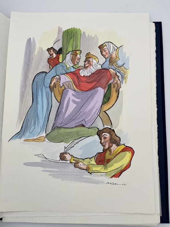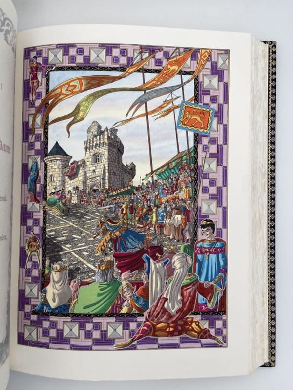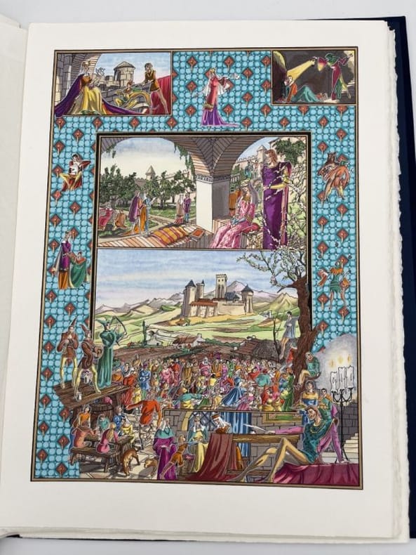 Nice Editions Sefer 1981 In-4, en feuilles, couverture bleue muette (emboîtage de l'éditeur).Cette belle édition rend hommage aux plus grands troubadours du XIIe siècle du midi de la France: Bernard de Ventadour, Bertran de Born, Guilhem de Cabestan, Cercamon le Gascon, Guillaume IX d'Aquitaine, Peire Vidal et Jaufré Rudel de Blaye. Elle constitue l'édition originale de la traduction de Joseph Pardo et est illustrée par Ansaldi de 16 planches en couleurs hors texte (dont une sur double page), reproduites en sérigraphie et rehaussées au pochoir; de plus, chaque page est ornée d'un encadrement en couleurs dessiné par l'illustrateur et rehaussé à la main. Tirage limité à 2.000 exemplaires numérotés et signés par l'artiste et l'éditeur. Un des 1.540 exemplaires sur vélin de Rives, bien complet du certificat de l'éditeur.