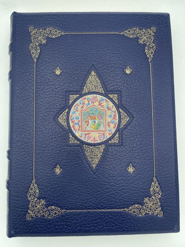 Nice Editions Sefer 1981 Grand in-4, bradel vélin orné sur le premier plat d'une composition imprimée en couleurs, dos portant le titre de l'ouvrage imprimé en bleu et noir sur un fond de motifs floraux dorés; doublures et gardes de soie moirée beige foncé, non rogné. Etui (reliure de l'éditeur).Cette belle édition rend hommage aux plus grands troubadours du XIIe siècle du midi de la France: Bernard de Ventadour, Bertran de Born, Guilhem de Cabestan, Cercamon le Gascon, Guillaume IX d'Aquitaine, Peire Vidal et Jaufré Rudel de Blaye. Elle constitue l'édition originale de la traduction de Joseph Pardo et est illustrée par Ansaldi de 16 planches en couleurs hors texte (dont une sur double page), reproduites en sérigraphie et rehaussées au pochoir; de plus, chaque page est ornée d'un encadrement en couleurs dessiné par l'illustrateur et rehaussé à la mainTirage limité à 2.030 exemplaires numérotés et signés par l'artiste et l'éditeur. Un des 1.540 exemplaires sur vélin de Rives. Un des exemplaires reliés par l'éditeur, bien complet du certificat.