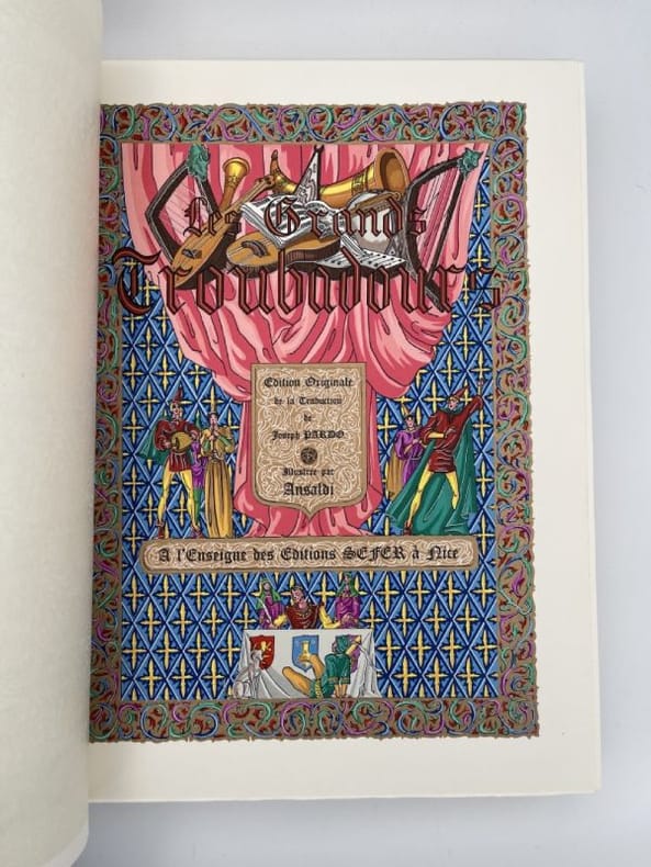 Nice Editions Sefer 1981 Grand in-4, bradel vélin orné sur le premier plat d'une composition imprimée en couleurs, dos portant le titre de l'ouvrage imprimé en bleu et noir sur un fond de motifs floraux dorés; doublures et gardes de soie moirée beige foncé, non rogné. Etui (reliure de l'éditeur).Cette belle édition rend hommage aux plus grands troubadours du XIIe siècle du midi de la France: Bernard de Ventadour, Bertran de Born, Guilhem de Cabestan, Cercamon le Gascon, Guillaume IX d'Aquitaine, Peire Vidal et Jaufré Rudel de Blaye. Elle constitue l'édition originale de la traduction de Joseph Pardo et est illustrée par Ansaldi de 16 planches en couleurs hors texte (dont une sur double page), reproduites en sérigraphie et rehaussées au pochoir; de plus, chaque page est ornée d'un encadrement en couleurs dessiné par l'illustrateur et rehaussé à la main Tirage limité à 2.030 exemplaires numérotés et signés par l'artiste et l'éditeur. Un des 150 exemplaires sur vélin de Rives, comportant 2 aquarelles originales en couleurs, une suite en bleu de France des illustrations hors texte et une planche hors-texte en couleurs encadrée (manquante dans notre exemplaire).