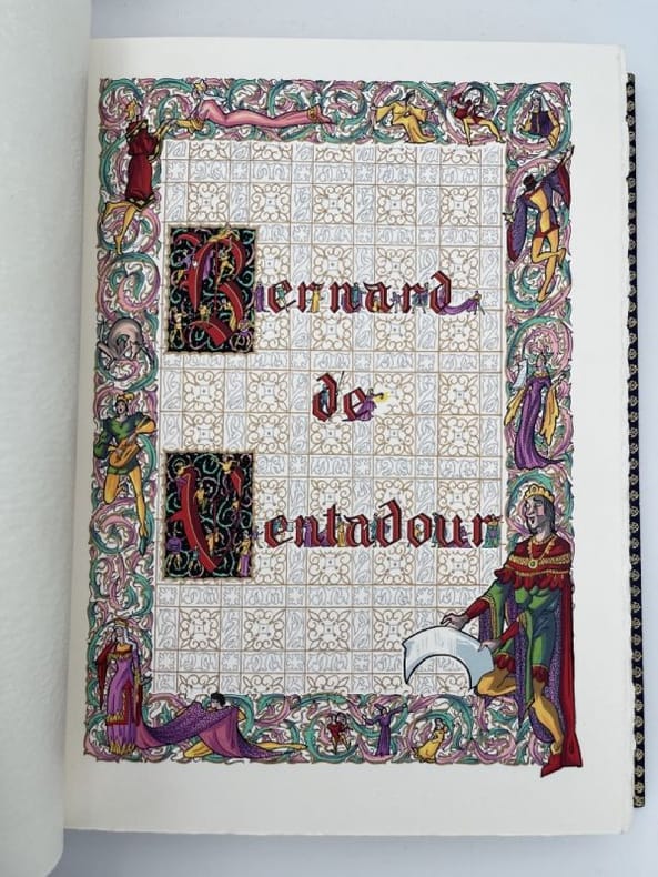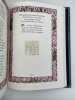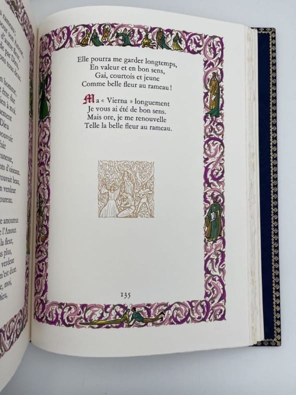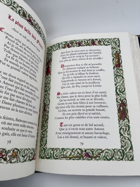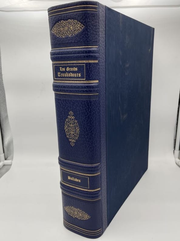 1 volume in-folio (37,5 x 27,5 cm), en feuillets sous étui en velours bleu nuit, titre gothique et doré sur le dos, [24]-151-[7] pages (complet). Très bon état. Première édition de la traduction originale de Joseph Pardo, richement illustrée par Ansaldi. Cette illustration se compose d’un encadrement à chaque page, d’un titre gravé, ainsi que de 15 illustrations hors-texte, dont une à double page. Le tirage de cette édition fut limité, entre autres, à 1500 exemplaires numérotés de 451 à 1990 (exemplaire n°672). Joseph Sauveur Pardo (1917-1990) est un éditeur d'art et traducteur. Il s’intéresse ici aux grands troubadours médiévaux : Bernard de Ventadour, Bertran de Born, Guilhem de Cabestan, Cercamon Le Gascon, Guillaume IX d’Aquitaine, Peire Vidal et Jaufré Rudel de Blaye. Bel exemplaire.