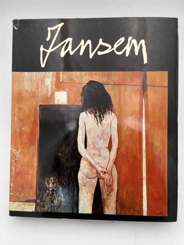 Paris, Galerie Matignon, 1997. Broché in-4 (29x25cm), couverture noire illustrée couleur d'un tableau de Jansem, à grands rabats, 59 pages illustrées en noir et couleur, atelier / peintures récentes, catalogue, textes de Meret Meyer et Sylvie Salles. Envoi dessiné de l'artiste en page de titre à COLLOMB* (1997), faisant allusion aux personnages de Pierrot et Colombine.