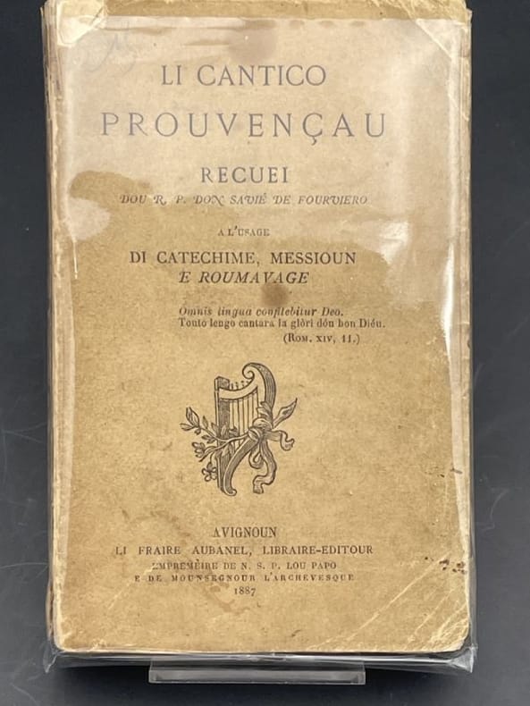 Li frairie Aubanel Avignoun, li frairie Aubanel, 1887. Petit In-12 broché de XLVI + 335 pages non coupées. Petit manque angulaire sur le haut de la couverture (tachée) et petite déchirure sans manque au bas du dos. Peu courant.