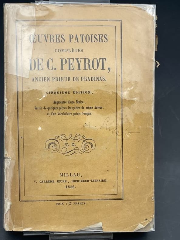 Jean-Claude Peyrot (1709-1795) devient prieur de Pradinas en 1748, à la suite de son oncle Jean Peyrot de Courtines. Il publiera ses "Poésies diverses patoises et française" en 1774, neuf ans après son retour à Millau. Bon état (reliure un peu frottée, frott. au second plat, qq. rouss.)