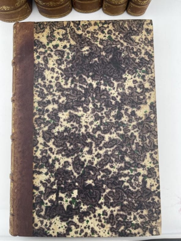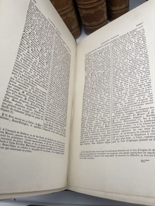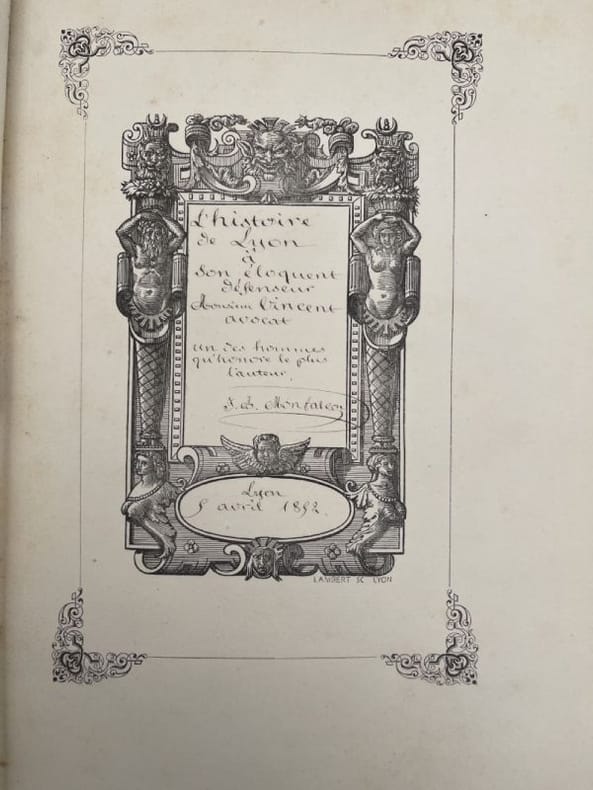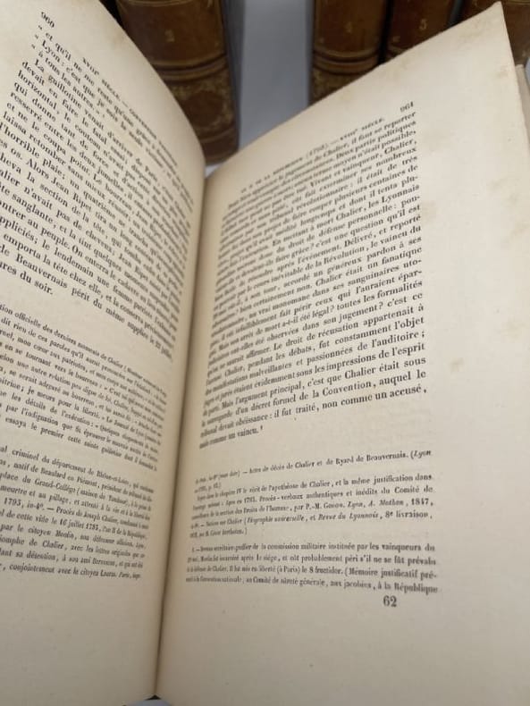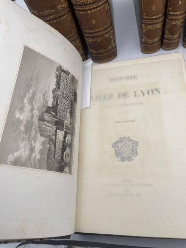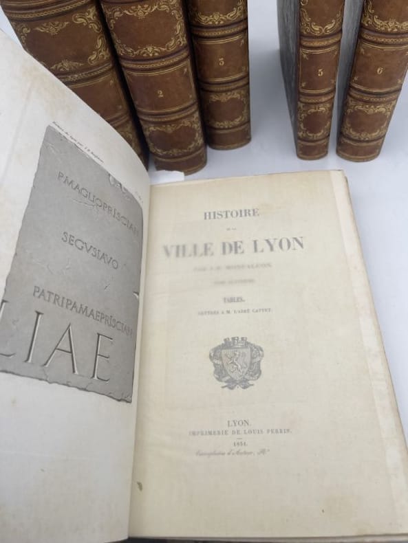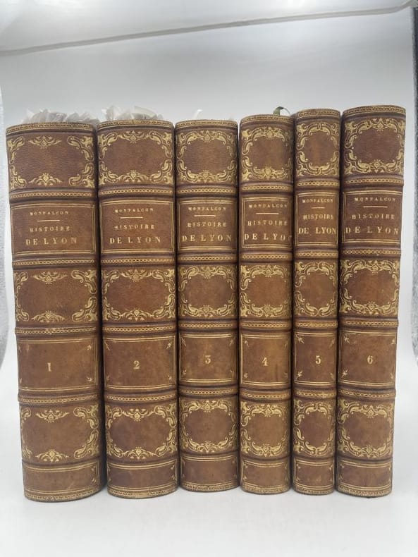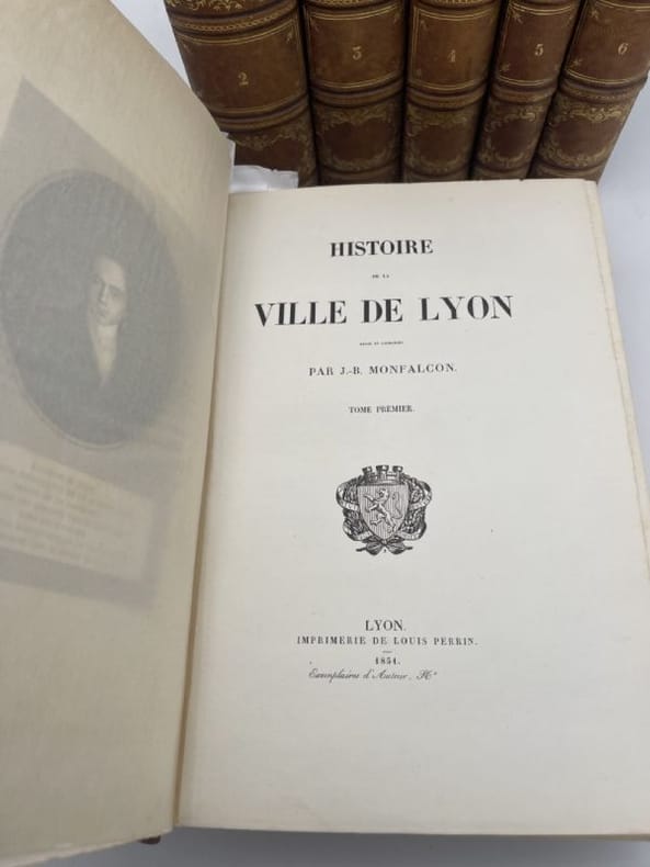 Perrin Lyon, de l'Imprimerie de Louis Perrin, 1851. 6 volumes petits in-4 reliés demi-chagrin fauve. Dos à nerfs très ornés à motifs dorés, titres dorés. 1451 pages en pagination continue sur les 4 premiers volumes. SUIVI DE : Dictionnaire historique des rues, places, ports, quais, ponts de la ville de Lyon et de la Croix Rousse, de Valse, des Brotteaux et de la Guillotière. Lyon imprimerie de Mougin Rusand 1849 : 66 pages. SUIVI De : table alphabétique générale de 14 feuillets non chiffrés. En fin du tome 4, on trouve : Lettres à M L'abbé CATTET sur l'histoire des guerres de religion à Lyon pendant le Seizième siècle : Lyon, Guilbert et Dorier 1847; ainsi que ; Seconde lettre à M L'abbé CATTET. Le tome 5 renferme : la bibliographie de l'Histoire de la ville de Lyon : 272 pages. Le tome 6 contient les Annales de Lyon 356 pages et complet de l'éloge de J F TERME. La lettre à Monsieur Auguste BERNARD est ici remplacée par la lettre de Mr REYNAUD. Un des 50 exemplaires complétés dits d'auteur, contenant 55 jolies gravures de paysages et vues de Lyon (au lieu de 54), gravées par Schroeder d'après les dessins de Richard. Epreuves avant la lettre, dites d'artistes. Portrait de l'auteur gravé par LEPINE en frontispice et monté sur chine, 5 planches d'inscription (au lieu de 4), 4 planches gravées d'armoiries de la ville contenant 8 dessins, cartes dépliantes et plans, vignettes, encadrements, fleurons. Bien complet également du grand plan de Lyon en 1848 gravé par STORCK. Exemplaire de VINCENT DE SAINT BONNET, premier avocat général près de la Cour Royale de Lyon ; comportant une jolie dédicace manuscrite dans un encadrement : "L'histoire de Lyon à son éloquent défenseur Monsieur Vincent avocat. Un des hommes qu'honore le plus l'auteur". Signé J B MONFALCON Lyon 5 avril 1852. Bel exemplaire.