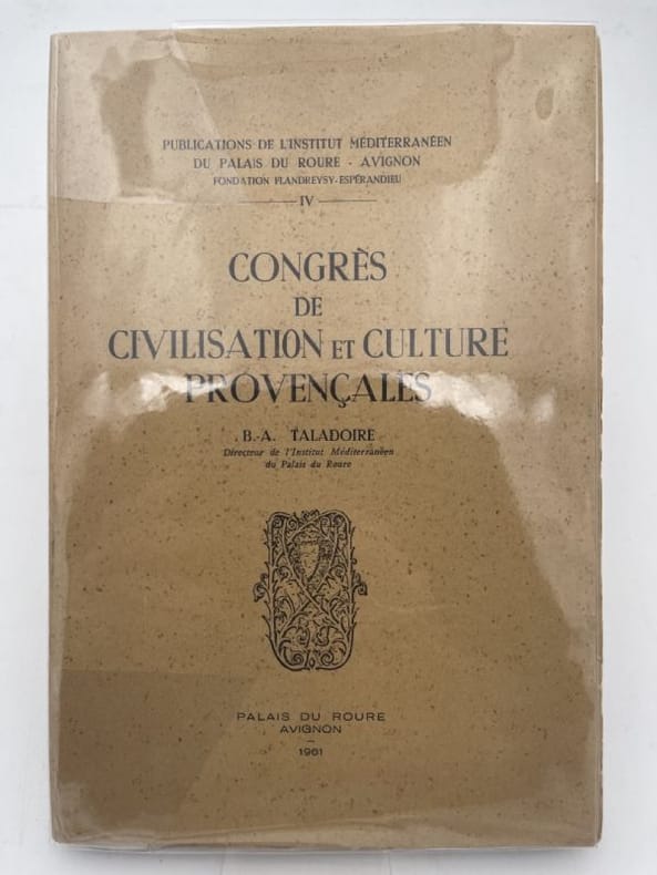 Actes du Congrès tenu en octobre 1957: communications de Barthélemy Antonin TALADOIRE, directeur de l'Institut méditerranéen du Palais de Roure, sur le Palais du Roure depuis 1918; de Jean Baptiste AQUARONE sur les relations intellectuelles entre le Portugal et le Midi de la France; de Marcel BONNET sur les Félibres et Emile Zola en 1868; de Charles CAMPROUX sur le Diable chez Mistral; de Henry GEORGE sur les Templiers en Provence; de Jean GRANAROLO sur les "affinités électives latines": Catulle, Anselme Mathieu et Paul Arène; de René JOUVEAU sur "légitimité d'une culture provençale"; d'Edgar LEROY sur le latin de Jaume de Nostredame; de Louis MAGGIANI sur la "sagesse provençale"; de Charles MAURON sur Mistral et Baudelaire; etc. 4è volume des Publications de l'Institut méditerranéen du Palais de Roure (Fondation Flandreysy-Espérandieu, Avignon).