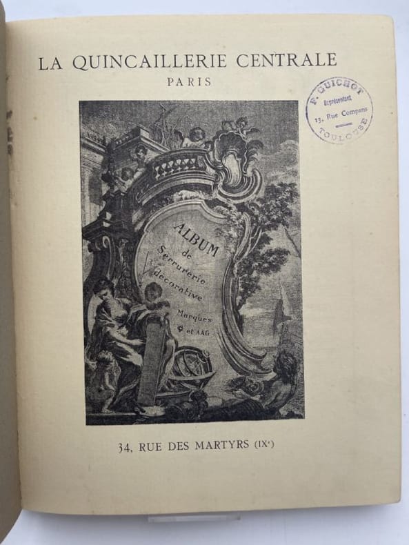 Paris, La Quincaillerie Centrale, 34, Rue des Martyrs 1930 In-4 27,5 x 21,5 cm. Reliure demi-percaline bleu-marine à coins, titre doré sur le dos lisse, VI pp. de texte, 21 figures, 249 planches classées par styles et par ordre alphabétique. Exemplaire en bon état.