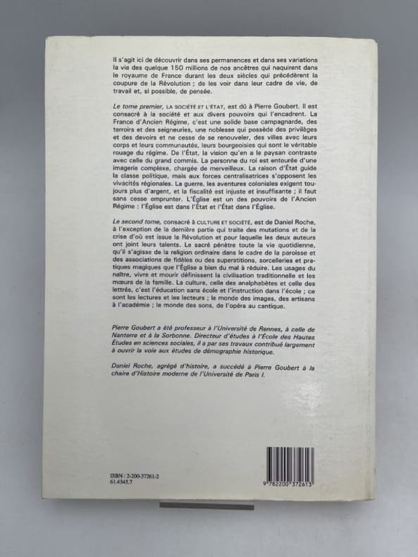 Un beau livre au style alerte, vivifié par de nombreux documents, une iconographie souvent inédite et de qualité ; foisonnant d'aperçus originaux, de petits faits curieux et révélateurs, égayé de savoureux portraits. Nous retrouvons ainsi, dans leur vie quotidienne, dix à douze générations de nos ancêtres qui vécurent de la Renaissance à la Révolution. Le tome premier, “La société et l'Etat”, est dû à Pierre Goubert. Il est consacré à la société et aux divers pouvoirs qui l'encadrent. La France d'Ancien Régime, c'est une solide base campagnarde, des terroirs et des seigneuries, une noblesse qui possède des privilèges et des devoirs et ne cesse de se renouveler, des villes avec leurs corps et leurs communautés, leurs bourgeoisies qui sont le véritable rouage du régime. La raison d'Etat guide la classe politique, mais aux forces centralisatrices s'opposent les vivacités régionales. Quant à l'Eglise, elle est dans l'État, comme l'Etat est dans l'Eglise. — Le second tome consacré à “Culture et société”, est de Daniel Roche, à l'exception de la dernière partie qui traite des mutations et de la crise d'où est issue la Révolution et pour laquelle les deux auteurs ont joint leurs talents. Le sacré pénètre toute la vie quotidienne, qu'il s'agisse de la religion ordinaire dans le cadre de la paroisse et des associations de fidèles ou des superstitions, sorcelleries et pratiques magiques que l'Eglise a bien du mal à réduire. Les usages du naître, vivre et mourir définissent la civilisation traditionnelle et les moeurs de la famille. La culture, celle des analphabètes et celle des lettrés, c'est l'éducation sans école et l'instruction dans l'école ; ce sont les lectures et les lecteurs ; le monde des images, des artisans à l'académie ; le monde des sons, de l'opéra au cantique.