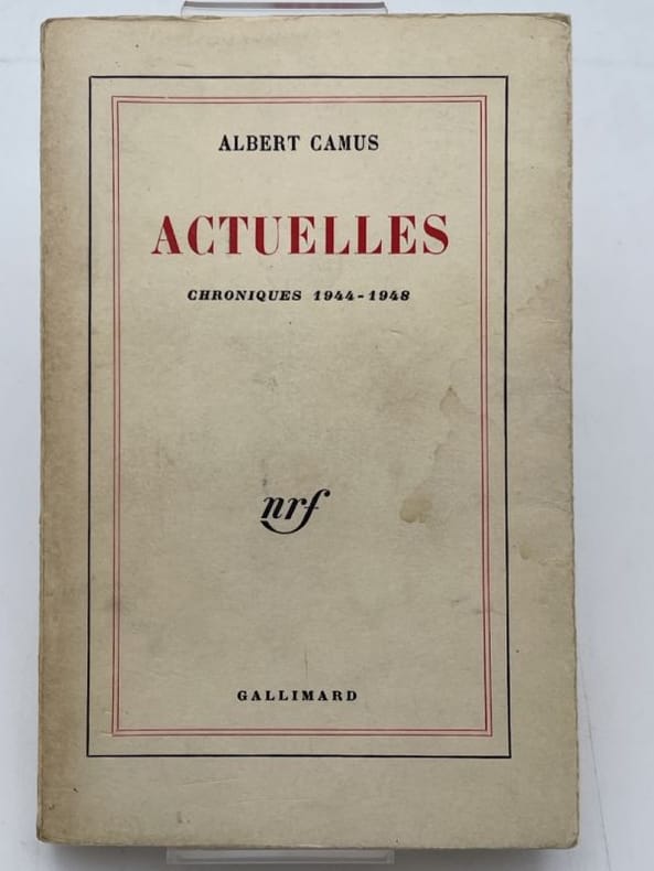 Actuelles – Chroniques 1944-1948 Paris, Éditions Gallimard, juin 1950, édition originale, mention fictive de 7 ème édition. Broché, 12 cm x 19 cm, 270 pages. Textes de Albert Camus. Bon état