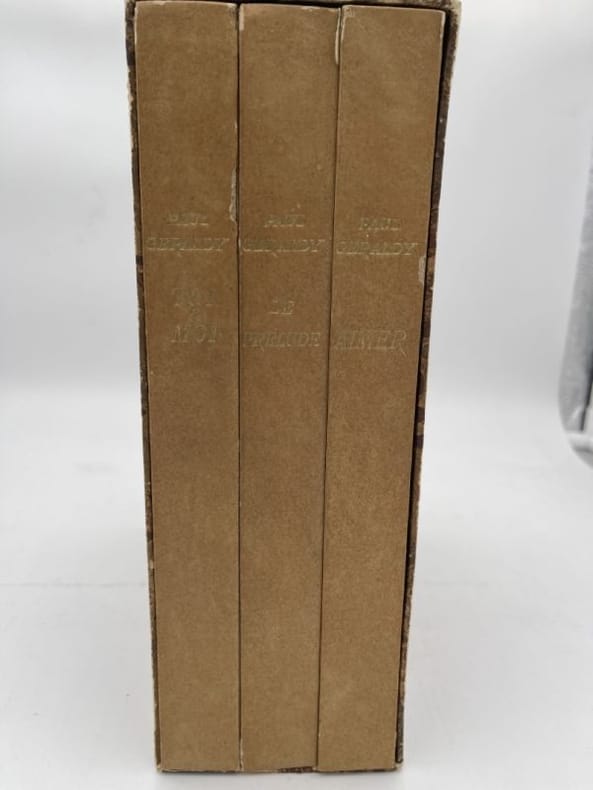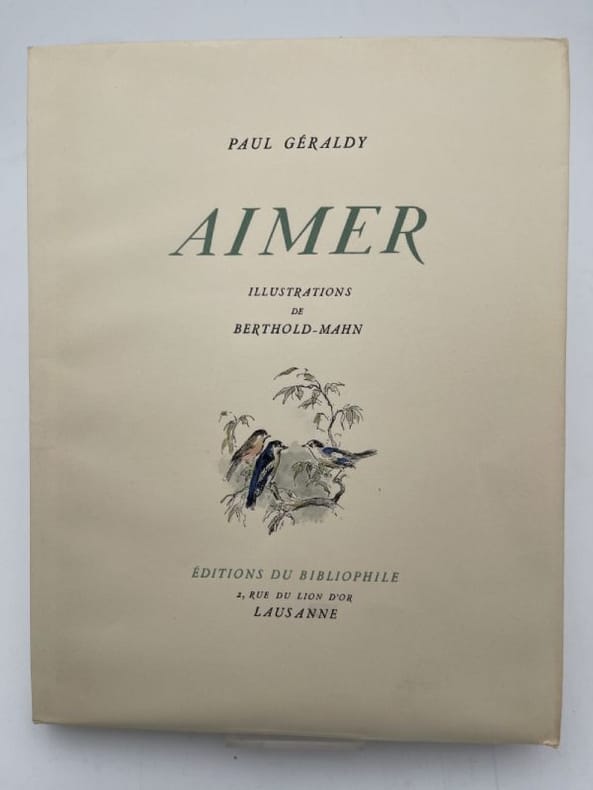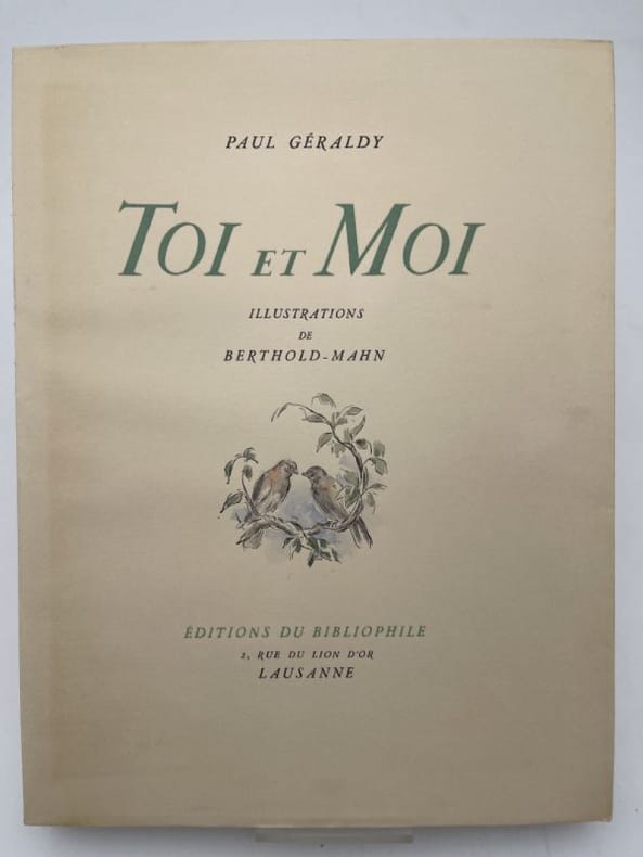 · GERALDY PAULToi et Moi. - Aimer. - Le Prélude. Illustrations de BERTHOLD-MANN.Lausanne, Editions du Bibliophile, mai 1942. 3 volumes, grands in-8°, reliure demi-cuir (dos passées légèrement), tête doré, sous emboitage, intérieur frais, 170, 163 et 157 pp.· Toi et moi : Planche en frontispice en couleurs et 25 charmantes compositions originales en couleurs, dont 1 vignette de couverture répétée sur le titre, 6 hors-texte et 18 dans le texte. Aimer : 19 compositions originales en couleurs, dont 1 vignette de couverture répétée sur le titre, 4 hors-texte et 14 dans le texte. Le Prélude : 20 compositions originales en couleurs, dont 1 vignette de couverture répétée sur le titre, 7 hors-texte et 12 dans le texte.· Un des 200 exemplaires numérotés de 1 à 200 sur papier Vélin teinté Annam, ici le n° 94· · Très bel ensembleLes envois hors de l'union européenne sont payants