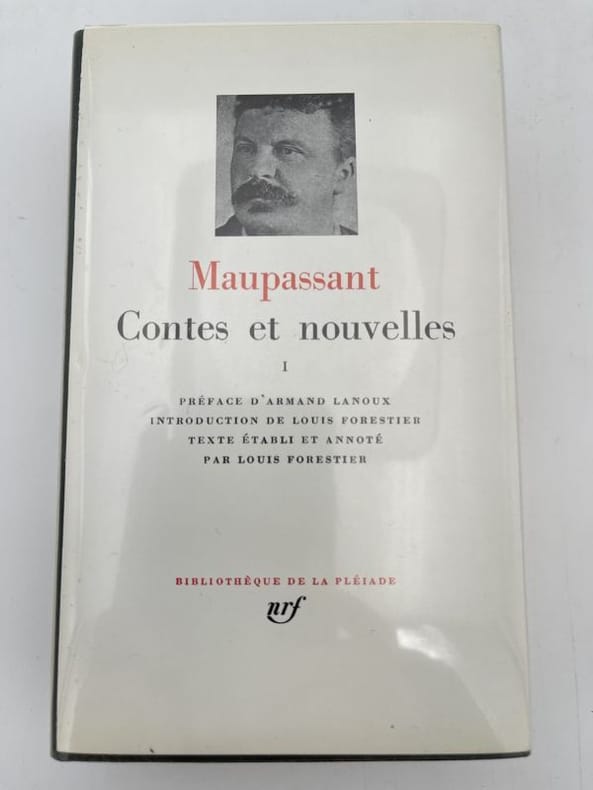 Gallimard NRF "Bibliothèque De La Pléiade", 1977-1979. 2 volumes In-12 reliés (17,5 x 11 cm), reliure éditeur plein cuir vert, dos lisse orné de filets dorés, jaquette blanche imprimée, rhodoïd, étui de carton gris de l'éditeur, 1776-1824 pages - Édition de Louis Forestier. Préface d'Armand Lanoux. Le volume contient : Contes et nouvelles publiés entre 1875 et mars 1884 - Supplément.- Le volume II contient : Contes et nouvelles publiés entre avril 1884 et 1893 - Contes posthumes. Appendice : Contes ajoutés - Supplément. Petit manque en bas d'un rhodoïd, très bon état par ailleurs.