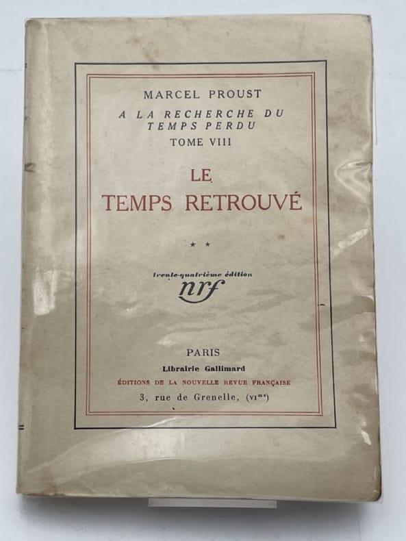 Gallimard Paris, Gallimard 1927. In-8 carré broché de 237 pages. A la recherche du temps perdu. 8. Le temps retrouvé. 1. Papier un peu jauni sinon bon état