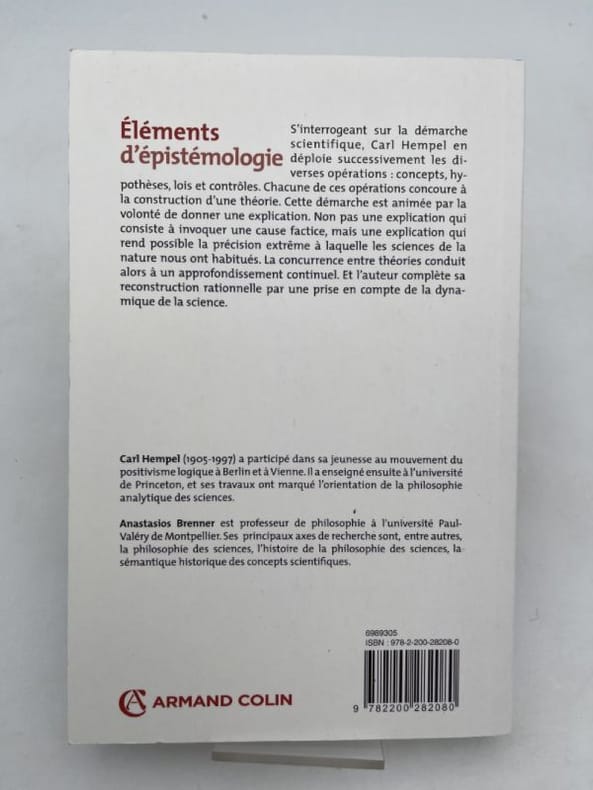 nouvelle édition en poche, 1991 "Contents, Chapitres : Note du traducteur, vii, Texte, 184 pages - 1. Objet de ce livre - 2. La recherche dans les sciences : Invention et mise à l'épreuve des hypothèses - 3. Tester une hypothèse : Logique et force de cette opération - 4. Critères de confirmation de d'acceptabilité - 5. Les lois et leur rôle dans l'explication scientifique - 6. Théories et explications théoriques - 6. La formation des concepts - 8. La réduction des théories - Bibliographie et index - Carl Gustav Hempel (né le 8 janvier 1905 à Oranienburg, Allemagne, mort le 9 novembre 1997 à Princeton, New Jersey) était un philosophe des sciences et une figure majeure de l'empirisme logique au cours du XXe siècle. Il est particulièrement bien connu pour l'articulation du modèle déductif-nomologique de l'explication scientifique, qui a été considérée comme le ""modèle standard"" de l'explication scientifique durant les années 1950 et 1960. (source : Wikipedia)" couverture à peine jaunie avec d'infimes traces de pliures aux coins des plats sans gravité, intérieur sinon frais et propre, nom de l'ancien propriétaire sur le haut de la première page - format de poche