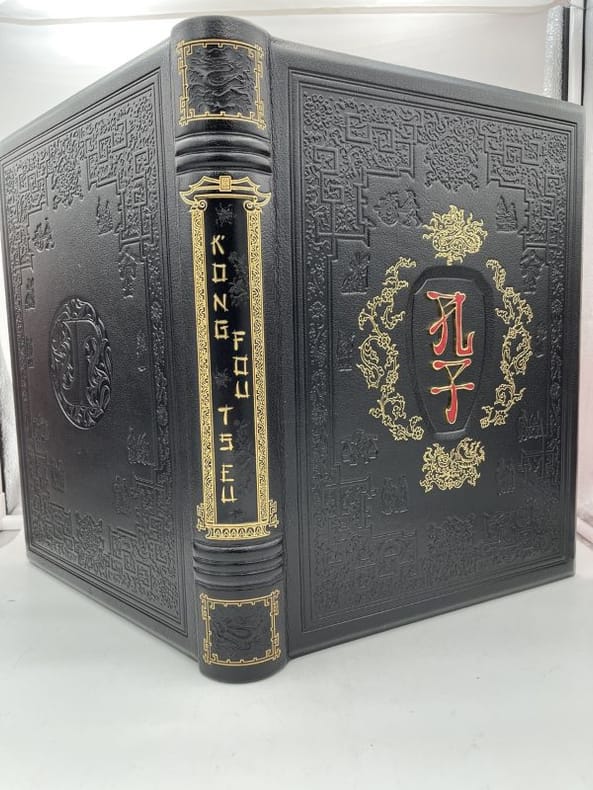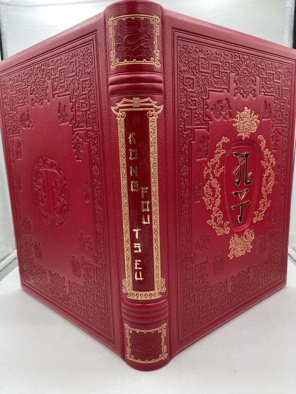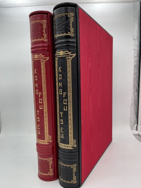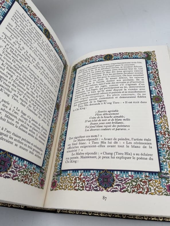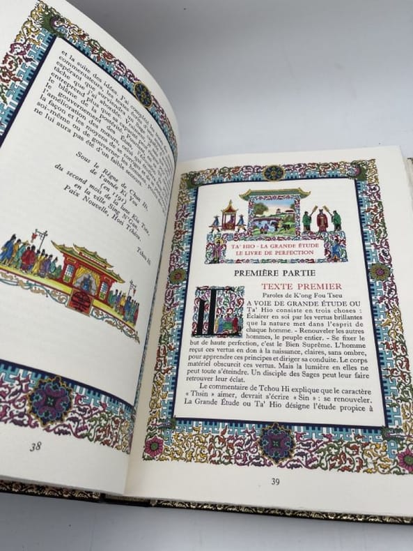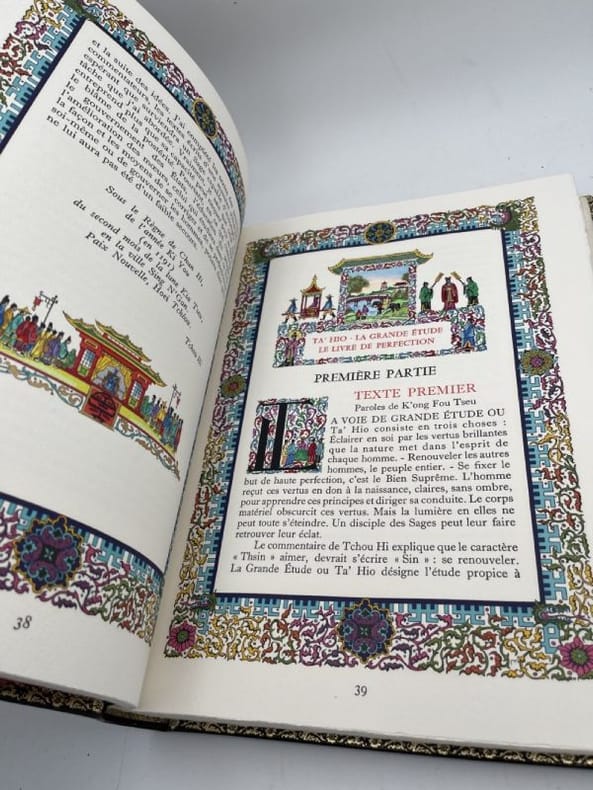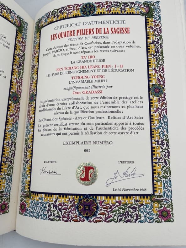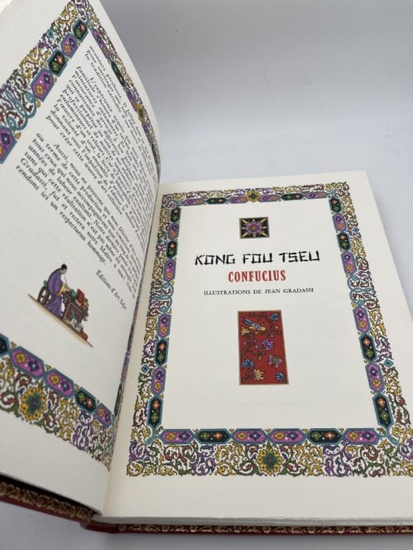Edition de Prestige -Art Sefer Monaco, Editions d'Art Sefer, éditions de Prestige. 1990. 2 volumes In-plano (30 x 39 x 5 cm) reliure d'Art Sefer plein chagrin noir pour le tome I, rouge pour le tome II. Dos à nerfs ornés de motifs fleurons dorés, plats estampés à froid et très décorés, dans l'esprit asiatique, de motifs dorés. Monogramme en métal doré incrusté sur chacun des deux plats. Gardes de tissu moiré noir et rouge, large roulette dorée intérieure. Têtes dorées. Chaque volume sous emboitage de cuir rouge ou noir, recouvert de tissu moiré et doublé de suédine. 144 et 150 pages+ feuillets blancs sur beau papier vélin figrané. Adaptation de Joseph Pardo. Suêrbes illustrations de Jean Gradassi, miniaturiste, sous serpentes. Exemplaire numéroté 605. Certificat d'authenticité signé par l'éditeur et par l'illustrateur. Nous y trouvons les textes suivants : Ta'Hio - La grande étude- Fen Tchang Hia Leang Pien I et II - Le livre de l'enseignement et de l'éducation - Tchoung Young - L'invariable milieu. Ensemble de prestige, comme l'a souhaité l'éditeur, en très bel état.