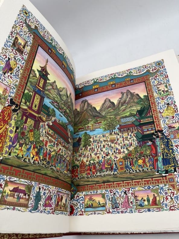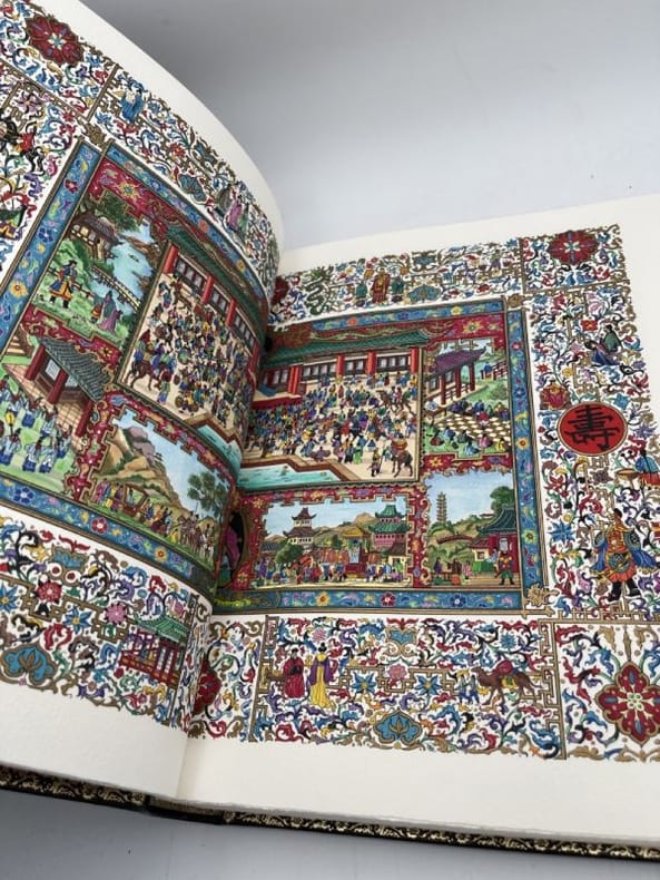 MONACO. EDITIONS ARTS ET COULEURS. 1988-1990. 2 VOLUMES IN-FOLIO (30 X 39,5 X 13 CENTIMETRES ENVIRON) DE 140 + (8) ET 134 + (8) PAGES, RELIURE DE L'EDITEUR PLEIN CHAGRIN NOIR, DOS A NERFS ORNE D'UN DECOR A FROID ET EN DORE, TITRE ET TETE DORES, PLATS BISEAUTES ORNES D'UN DECOR A FROID ET EN DORE, LETTRES CHINOISES METALLIQUES LAQUEES EN ROUGE AU CENTRE DES PLATS SUPERIEURS, DENTELLE INTERIEURE DOREE, GARDES DE SOIE MOIREE, NON ROGNES, SOUS ETUI BORDE DE L’EDITEUR RECOUVERT EGALEMENT DE SOIE MOIREE. ILLUSTRE DE NOMBREUSES COMPOSITIONS IN ET HORS-TEXTE, DANS LE STYLE DE L'ENLUMINURE, MISES EN COULEURS A LA MAIN. PREMIER TIRAGE LIMITE A 1280 EXEMPLAIRES NUMEROTES, DONT 30 HORS-COMMERCE, TOUS SUR VELIN D'ARCHES, CELUI-CI PORTANT LE NUMERO 818 ET ACCOMPAGNE DE SON CERTIFICAT D'AUTHENTICITE AU MEME NUMERO SIGNE PAR L'ARTISTE ET L'EDITEUR. TRES BEL EXEMPLAIRE.