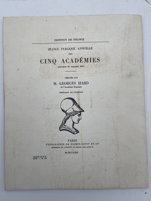 Firmin Didot Paris, Firmin Didot 1972. Institut de France. Plaquette in-4 brochée de 54 pages. Présidée par M Goerges Izard. Couverture salie