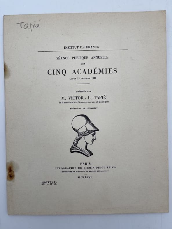 Firmin Didot Paris, Firmin Didot 1971. Institut de France. Plaquette in-4 brochée de 58 pages. Présidée par M Victor L Tapie. Tache en couverture