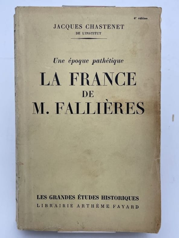 Armand Fallières (1841-1931) fut président de la République française de 1906 à 1913. — “La France de M. Fallières” permet à Jacques Chastenet de brosser une grande fresque vivante, animée, colorée. Ces pages présentent un particulier intérêt parce que l'auteur a tenu à mettre en relief les aspects les plus variés de cette « époque pathétique » où la majorité des Français se croyait destinée à vivre pour toujours dans un pays pacifique et sans histoire... Jacques Chastenet nous démontre que les privilégiés de ces temps heureux se bouchaient volontairement les yeux pour ne pas voir la réalité. L'admission au dictionnaire de l'Académie du mot “épater” constituait un véritable événement. Il est vrai que Paul Bourget pouvait écrire gravement : « L'Académie française représente, avec le Vatican et la Chambre des Lords, l'un des trois piliers de la civilisation. » (Georges Huisman, Hommes et mondes, 1951)