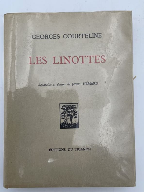 Editions du Trianon 1929 1930 Editions du Trianon, 8 volumes, 1929-1930, demi-chagrin à coins vert, environ 225x170mm, tranches supérieures dorées, couvertures d'origine conservées (2 dos restaurés), édition sur vélin de fil du Marais non numérotée, un portrait de Courteline en frontispice du tome 1, aquarelles et dessins de Joseph Hémard. Reliures insolées, quelques frottements d'usage sur le cuir des reliures, un petit accroc sans manque en bordure de quelques pages (tome 7) une petite image contrecollée sur une page garde, une page de garde roussie (tome 3). Bon état pour le reste.