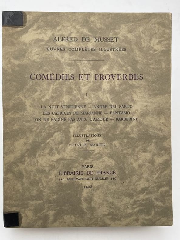 Paris L'Edition d'Art H. Piazza 1932 in 8 (19x13,5) 12 volumes reliures demi maroquin rouge à longs grains, et petits coins, dos à nerfs soulignés de filets dorés et ornés de très fins fleurons dorés, têtes dorées, couvertures illustrées en couleurs conservées. Avec de nombreux ornements décoratifs et 309 illustrations en couleurs dont 12 frontispices pleine page de André-E. Marty, gravés sur bois par E. Gasparini. Tome I: Poésies I - Contes d'Espagne et d'Italie; Poésies diverses. Tome II: Poésies II - Un spectacle dans un fauteuil; Poésies nouvelles. Tome III: Poésies III - Poésies nouvelles (suite et fin). Tome IV: Comédies et Proverbes I - André del Sarto; Lorenzaccio. Tome V: Comédies et Proverbes II - Les caprices de Marianne; Fantasio; On ne badine pas avec l'amour. Tome VI: Comédies et Proverbes III - La nuit vénitienne; Barberine; Le chandelier. Tome VII: Comédies et Proverbes IV - Il ne faut jurer de rien; Un caprice; Il faut qu'une porte soit ouverte ou fermée; Louison. Tome VIII: Comédies et Proverbes V - On ne saurait penser à tout; Carmosine; Bettine. Tome IX: Nouvelles et Contes I - Emmeline; Les deux maitresses; Frédéric et Bernerette. Tome X: Nouvelles et Contes II - Le fils du Titien; Margot; Croisilles; Pierre et Camille. Tome XI: Nouvelles et Contes III - Le secret de Javotte; Histoire d'un merle blanc; Mimi Pinson; La mouche. Tome XII: La confession d'un enfant du siècle. Tirage limité à 2250 exemplaires, celui-ci un des 200 exemplaires numérotés sur pur fil de Rives contenant une suite en noir des illustrations. Reliures non signées, mais attribuables à A. Valat (relieur à Montpellier). Superbe ensemble, très finement relié, ors rutilants ( Photographies sur demande / We can send pictures of this book on simple request )