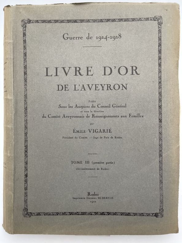 Subervie Rodez Subervie 1922, Tome III Arrondissement de Rodez, In-folio broché, 364 pages, avec de nombreuses photos des soldats décédés ou disparus, leur état civil et leurs états de service. Une trace d'humidité en marge des premières pages sans gravité ni atteinte au texte. Bon état. Rare