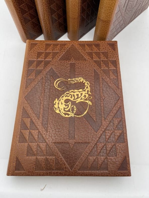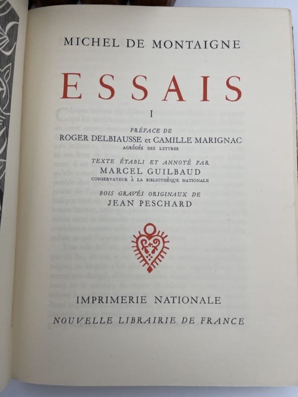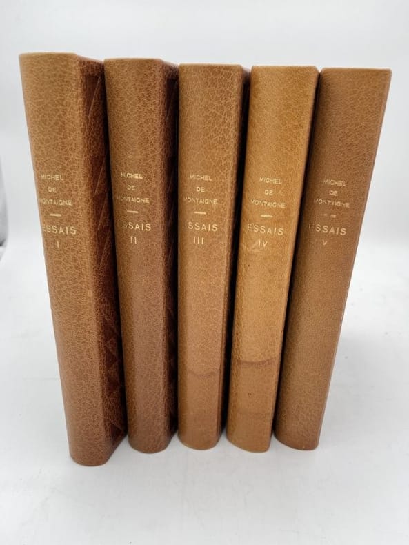 Nouvelle Librairie de France Nouvelle Librairie de France, 1962, Imprimerie Nationale. 5 volumes In-8 reliés plein chagrin havane, dos lisses, plats estampés à froid et fleurons doré représentant un dragon, têtes dorées, couvertures conservées. 338 +362 + 365 + 366 + 394 pages. Préface de Roger Delbiausse et Camille Mérignac, texte établi et annoté par Marcel Guilbaud, bois gravés originaux de Jean Peschard. Dos légèrement passés. Très bon ensemble, en bel état.