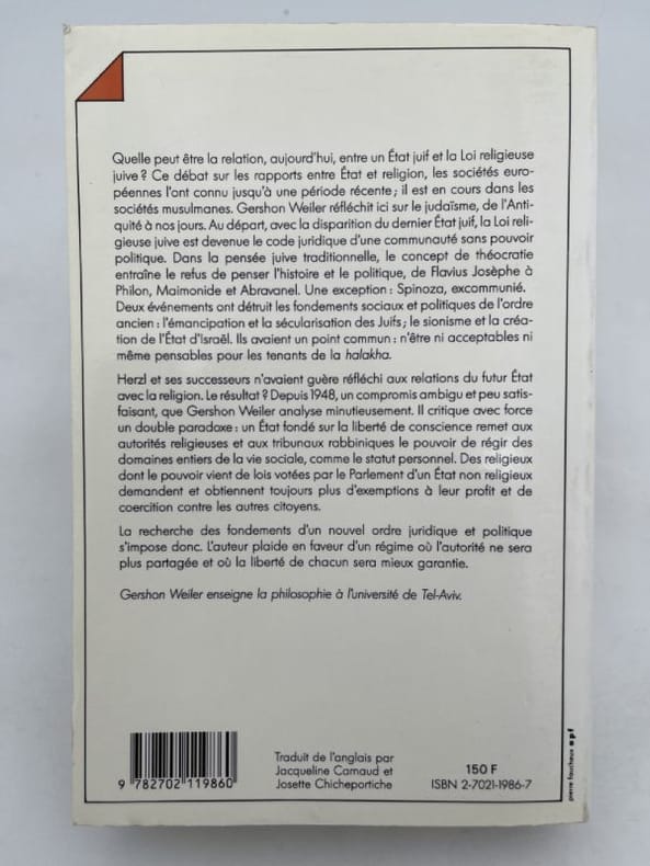 "Quelle peut être la relation, aujourd'hui, entre un Etat juif et la Loi religieuse juive ? Ce débat sur les rapports entre Etat et religion, les sociétés européennes l'ont connu jusqu'à une période récente ; il est en cours dans les sociétés musulmanes. Gershon Weiler réfléchit ici sur le judaïsme, de l'Antiquité à nos jours. Au départ, avec la disparition du dernier Etat juif, la Loi religieuse juive est devenue le code juridique d'une communauté sans pouvoir politique. Dans la pensée juive traditionnelle, le concept de théocratie entraîne le refus de penser l'histoire et le politique, de Flavius Josèphe à Philon, Malmonide et Abravanel. Une exception : Spinoza, excommunié. Deux événements ont détruit les fondements sociaux et politiques de l'ordre ancien : l'émancipation et la sécularisation des Juifs ; le sionisme et la création de l'Etat d'Israël. Ils avaient un point commun : n'être ni acceptables ni même pensables pour les tenants de la halakha. Herzl et ses successeurs n'avaient guère réfléchi aux relations du futur Etat avec la religion. Le résultat ? Depuis 1948, un compromis ambigu et peu satisfaisant, que Gershon Weiler analyse minutieusement. Il critique avec force un double paradoxe : un Etat fondé sur la liberté de conscience remet aux autorités religieuses et aux tribunaux rabbiniques le pouvoir de régir des domaines entiers de la vie sociale, comme le statut personnel. Des religieux dont le pouvoir vient de lois votées par le Parlement d'un Etat non religieux demandent et obtiennent toujours plus d'exemptions à leur profit et de coercition contre les autres citoyens. La recherche des fondements d'un nouvel ordre juridique et politique s'impose donc. L'auteur plaide en faveur d'un régime où l'autorité ne sera plus partagée et où la liberté de chacun sera mieux garantie. Voir le sommaire sur photos jointes"