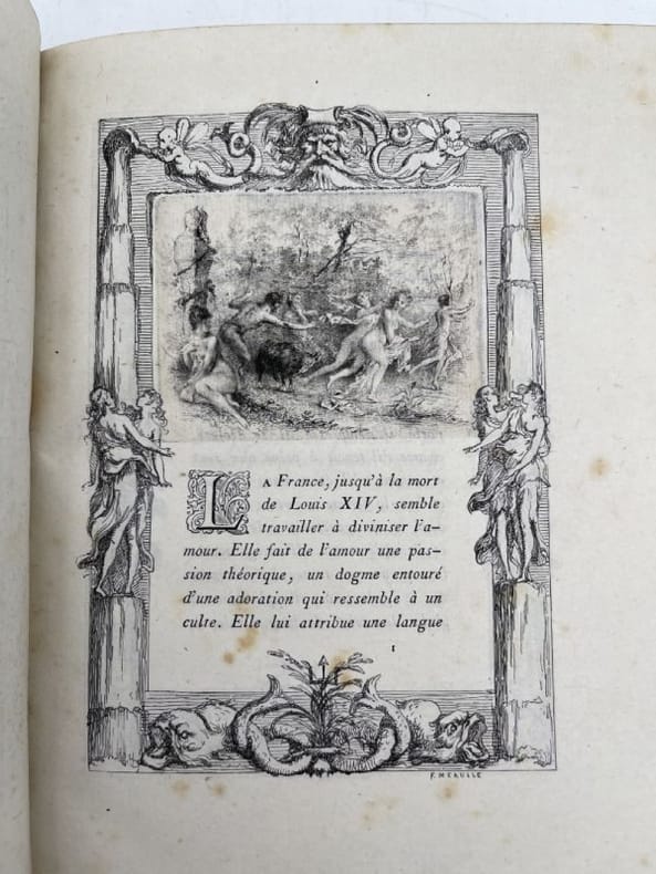 Première édition séparée d'un chapitre de la femme au XVIIIe siècle. Exemplaire sur vélin teinté. Frontispice gravé à l'eau-forte par Boilvin, ainsi qu'un en-tête et un cul-de-lampe. Texte présenté dans un encadrement gravé sur bois de F. Méaudre (deux dessins d'encadrement). Bon état d’occasion