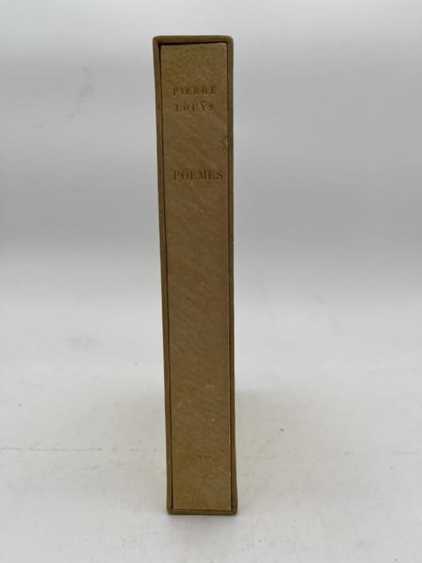 Sans lieu, sans nom, (1947 ?). Dimensions : 19 x 14 cm. Reliure janséniste signée Legendre, en plein maroquin noisette, dos à cinq nerfs titré à l’or avec date en pied, doubles filets dorés sur les coupes et les coiffes, contreplats doublés de soie moirée, dans un encadrement à quadruple filet doré, tête dorée. Chemise à bande (papier marbré à la cuve) et étui assortis. Exemplaire exceptionnel, à plus d’un titre, du livre Images et Poèmes. Vingt poèmes inédits ornés d’images dessinées sur pierres par René Demeurisse, qui parut aux éditions Rombaldi en 1944. En effet, celui-ci a été vraisemblablement composé « sur mesure » pour René Gas par un cercle d’amis et de collaborateurs proches. Imprimé sur vélin de Rives, il comporte également, comme les 10 exemplaires du tirage de tête, 2 suites (une en noir, une en sanguine) en plus des lithographies en noir. Mais il a été considérablement enrichi, notamment de 2 dessins originaux, avec envois autographes signés de Demeurisse, ainsi que de nombreux manuscrits (lettres autographes, poèmes ou textes en plusieurs versions, …), d’épreuves, d’une partition musicale, d’un prospectus d’annonce. Sont donc bien présents les vingt poèmes de Paul Aeschimann, Pierre Camo, Francis Carco, Philippe Chabaneix, Henry Charpentier, Maurice Chevrier, Guy-Charles Cros, Maurice Du Plessys, Gabriel-Joseph Gros, José Maria de Heredia, Robert Houdelot, Gérard D’Houville, Louis Krémer, Yves-Gérard Le Dantec, Pierre Louÿs, Fernand Mazade, Vincent Muselli, Raoul Ponchon, Emmanuel de Thubert, Paul Valéry, avec les illustrations de Demeurisse et les 2 suites. S’y ajoutent : -des copies manuscrites de 2 poèmes, l’un de Guillaume Apollinaire, l’autre de Jean-Marc Bernard (De profundis). -des contributions variées de Paul Aeschimann (1 L.A.S.), Pierre (de Bréville ?) [partition musicale], Pierre Camo (2 poèmes manuscrits, un sonnet imprimé et illustré), Philippe Chabaneix (6 poèmes), Henry Charpentier (5 manuscrits et 1 tapuscrit), Robert Houdelot (15 poèmes), Yves-Gérard Le Dantec (3 poèmes + 1 L.A.S.), Paul L… ? (1 poème), André Mary (4 poèmes), Vincent Muselli (14 poèmes + 2 L.A.S.), Emmanuel de Thubert (1 poème), Léon Vérane (1 poème), Albert Lauzero (1 lettre autographe signée et illustrée). Ensemble tout à fait original, émouvant témoignage de l’affection que portaient à René Gas les auteurs ou illustrateurs qu’il publiait notamment dans le cadre de ses fonctions au sein des éditions Rombaldi. René Gas (né en 1896 ?) était et reste un homme de l’ombre, sur lequel on dispose de peu d’informations. On sait cependant qu’il a d’abord travaillé au sein des éditions Georges Crès et Cie. En 1925, il prend la co-direction, avec Camille Sauty, de cette maison dont il conserve le nom et l’esprit. Mais la société affronte des difficultés financières si importantes qu’elles entraînent sa faillite en 1935. Vers la fin des années 1940, on retrouve René Gas chez Rombaldi, comme directeur de collection : il s’occupe notamment de celle qui rassemble les « maîtres de l’estampe française contemporaine », publiant de luxueux albums. Les liens tissés au fil de sa carrière, tant avec des écrivains qu’avec de nombreux artistes, l’ont probablement incité à se lancer dans le marché de l’art : devenu directeur de la galerie André Maurice, sise au 140 boulevard Haussmann à Paris, il expose des œuvres de Jean Marchand, Charles Camoin, Henry E. Burel, Lucien Mainssieux, etc.