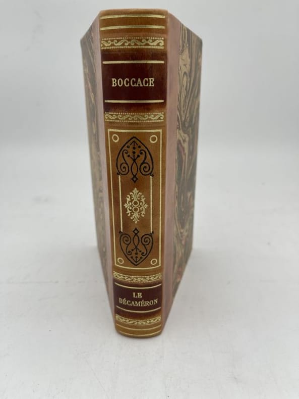 Les contes autrement nommés Le Décaméron de Maistre Jean Boccace Florentin Le "Décaméron" est une collection de contes écrits par l'auteur italien Giovanni Boccaccio. Il a été écrit au XIVe siècle, entre 1349 et 1351, et est l'une des œuvres les plus importantes de la littérature italienne et européenne du Moyen Âge. Le titre "Décaméron" est dérivé des mots grecs "deka" (dix) et "hemera" (jour), ce qui signifie "dix jours", car la structure de l'œuvre consiste en dix récits racontés par un groupe de jeunes nobles qui se réfugient dans une villa en dehors de Florence pour échapper à la peste bubonique qui ravage la ville. Chaque jour, l'un des jeunes est nommé roi ou reine et choisit un thème pour les histoires qui seront racontées ce jour-là. Les contes du "Décaméron" couvrent un large éventail de genres et de thèmes, de histoires comiques et amoureuses à des contes moralisateurs et satiriques. L'œuvre est connue pour son style agréable et sa représentation vivante de la société italienne de l'époque. De plus, le "Décaméron" a eu une influence significative sur la littérature ultérieure et a été une source d'inspiration pour de nombreux écrivains et artistes au fil des siècles. Le "Décaméron" est une œuvre fondamentale de la littérature italienne et européenne de la Renaissance, et est un exemple précoce de la prose narrative dans la tradition littéraire occidentale. Complet en trois tomes, reliures plein cuir vert, 21x14, ornées sur le dos de motifs dorés, représentant des personnages, et ornées sur les plats des mêmes motifs dorés, entourant un écusson doré, tranches dorées, 342, 308 et 292 pages Illustrés d'un portrait en frontispice et de 237 bois anciens dont les incunables florentins de la première édition illustrée. Jean de Bonnot, 1977