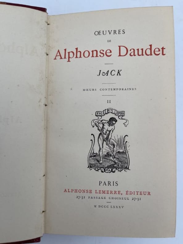 Paris Dentu 1876 2 vol. relié 2 vol. in-12, demi-veau vert, dos lisses à faux nerfs marquées de filets dorés et à froid, frises dorées en tête et pied, pièces de titre et de tomaison de basane rouge, non rognés, 396 et 366 pp. Édition originale avec cette dédicace imprimée : « Ce livre de pitié, de colère et d'ironie est dédié à Gustave Flaubert, mon ami et mon maître. Alphonse Daudet ». Superbe roman social où Daudet nous fait partager la vie du jeune Jack, fils adultérin d'une demi-mondaine... Ex-libris à la mine de plomb André Pastré au premier volume. Dos légèrement passés, avec petite restauration à la coiffe supérieur du deuxième volume, sinon agréable exemplaire en reliure d'époque.