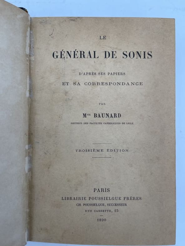 LE GÉNÉRAL DE SONIS d'après ses papiers et sa correspondance, par M.Baunard vol in-8°, 200x135, 613 pp, un portrait photo en frontispice, reliure demi-chagrin, qqs rousseurs éparses, bel état Table : La Guadeloupe, la France, le collège (1825-1844) ; Saint-Cyr, Castres, Paris, Limoges (1844-1854) ; L'Algérie, la Kabylie (1854-1859) ; la campagne d'Italie (mai-août 1859) ; le Maroc (octobre 1859) ; Tenez, Laghouat, Saïda (1860) ; combat de Metlili, une expédition dans le désert (1865-1866) ; Laghouat, la vie chrétienne ; combat d'Aïn-Mahdi (1869) ; Aumale (1869-1870) ; l'armée de la Loire, Brou et Loigny (1870. Récit circonstancié des opérations militaires autour de Châteaudun et dans la journée de Loigny, quand le général de Sonis commandait le 17e corps) ; l'ambulance et le congé (1871) ; Rennes (1871-1874) ; Saint-Servan (1874-1880) ; Châteauroux, Limoges (1880-1883) ; Paris, l'éternité (1883-1887). Paris, Poussielgue, 1893 ref/116