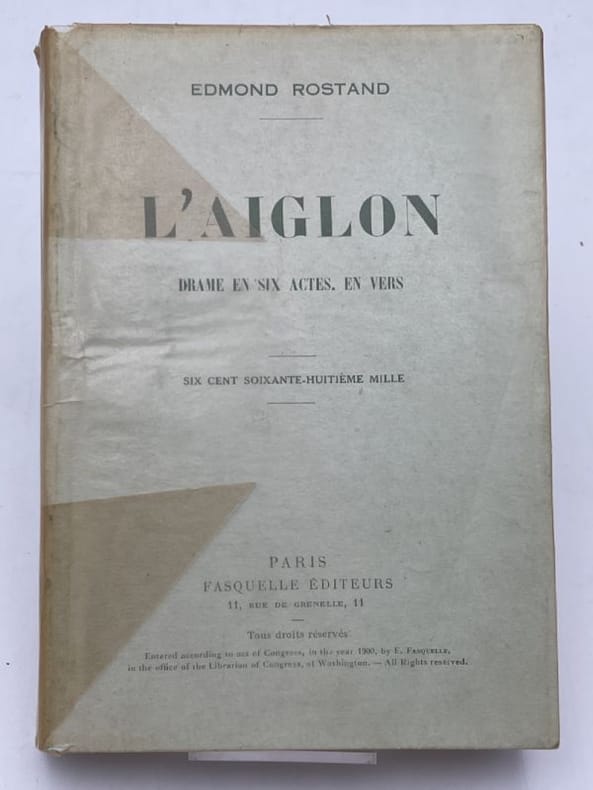 Paris Eugène Fasquelle Sans date. 262 pp. In-12. Relié. En bon état. 1 volume. 314ème mille.L'Aiglon est un drame d'Edmond Rostand écrit en 1900 et représenté pour la première fois à Paris, au théâtre Sarah-Bernhardt, le 15 mars 1900. « L'Aiglon » désigne le fils de Napoléon Ier (l'Aigle) et de Marie-Louise d'Autriche, également connu sous les noms de roi de Rome, de Napoléon II, de duc de Reichstadt. Dans ce drame en six actes, écrit en alexandrins, l'Aiglon, fils de Napoléon, cherche qui il est par rapport à son père, et cherche à marcher dans ses traces et ne pas être « un front qui se colle à des vitres ».Parmi les scènes remarquables, on peut noter la dernière scène de l'acte III.