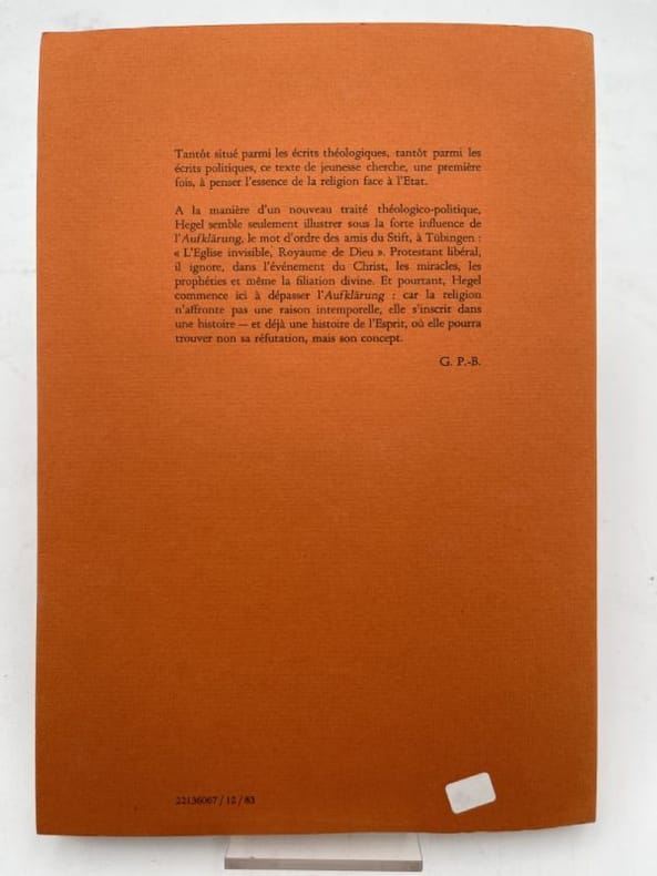 Paris PUF Paris, Éditions des Presses Universitaires de France, 1983. Collection : Épiméthée, dirigée par Jean-Luc Marion. Petit in-8 broché, avec couverture orange à rabats, de 138 pages. Marques de scotch sur les rabats. Feuillets des pages de garde et tranche touchés d'insolation.