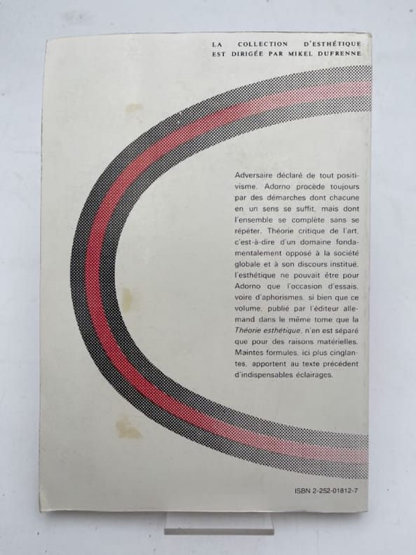 Collection d'esthétique n°25 - traduit de l'allemand par Marc Jimenez et Eliane Kaufholz. Classification Dewey : 100-PHILOSOPHIE ET DISCIPLINES CONNEXES