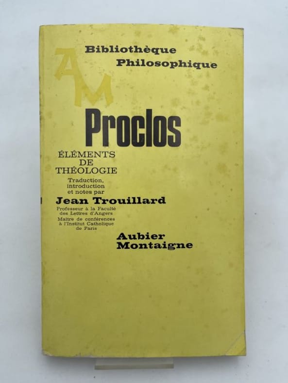 Paris Aubier Montaigne Paris, Éditions Aubier Montaigne, 1965. Collection : Bibliothèque philosophique. In-8 broché de 192 pages. Traduction, introduction et notes par Jean Trouillard. Couverture défraîchie, légèrement abrasée en bordures. Marques scotch en contreplats. Bon état