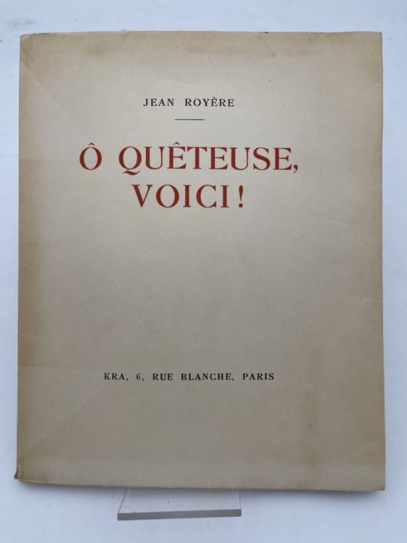 Kra Paris 1928 In-8 carré ( 235 X 170 mm ) de 61 pages, broché sous couverture rempliée. Edition originale non justifiée sur Japon, exemplaire enrichi: - D'un envoi autographe signé de Jean ROYERE avec quatrain "à Marie". - D'un envoi autographe signé de Jean ROYERE à Louis BARTHOU. - D'un long poème autographe signé de FAGUS: Variations sur "Ô quêteuse, voici". - D'une lettre autographe signée de FAGUS à Jean ROYERE. Très bel exemplaire non rogné ( témoins conservés ), agréablement enrichi.