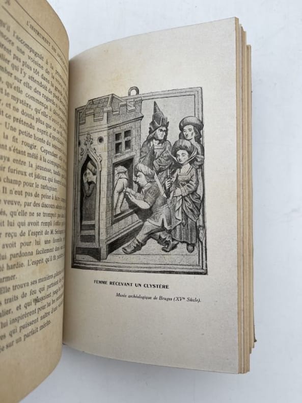 Jean Fort Jean Fort, sans date - 1920. In-8 relié pleine basane beige mouchetée, dos lisse à filets dorés et pièces de titre. 222 pages. 11 vignettes de M. VAN MAEL, 7 hors-texte d'après les gravures de l'époque. Collection Les Amis du Bon Vieux Temps. Sous-titre : Le clystère dans l'humour et la littérature. Anecdotes de Tallement des Réaux. Saint-Simon etc. L'éloge de la seringue, réimpression complète. Ma tante Geneviève. Le Mousquetaire à genoux. Le cas Antoinette Boyau. Le petit Parnasse des Apothicaires : Grécourt, Collier, La Fontaine, Dulaurens, Béranger, etc. Le texte L'Éloge de la seringue a été publié originellement, en 1757, sous le titre Éloge burlesque de la seringue. Son origine, son histoire, ses transformations avec un projet nouveau pour la perfectionner. Il s'agit d'un petit opuscule facétieux extrait des Mémoires de l'Académie de la ville neuve de Nancy, qui sont le produit d'une débauche d'esprit ayant pour but de verser le ridicule sur les diverses Académies. Curieux ouvrage sur la seringue et le clystère que MAC-ORLAN signe sous un pseudonyme. Très bon état.Ouvrage original et curieux mêlant humour, anecdotes littéraires et histoire médiévale ; Cest moins un manuel technique quun ouvrage littéraire et satirique illustré sur le thème des instruments de pharmacie et de ses représentations dans la littérature. Claude de Saint-Hieble :Pseudonyme utilisé par Pierre Dumarchey, mieux connu sous le nom de Pierre Mac-Orlan, écrivain français du début du XX siècle. Rare.