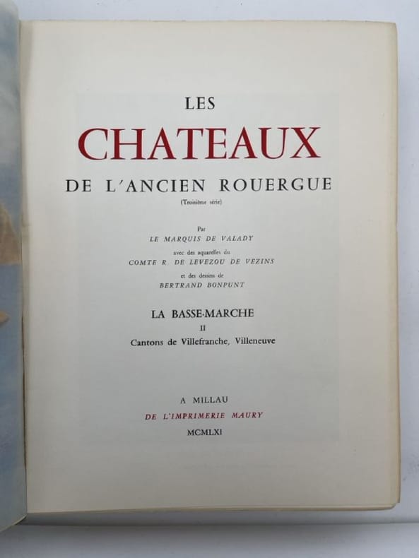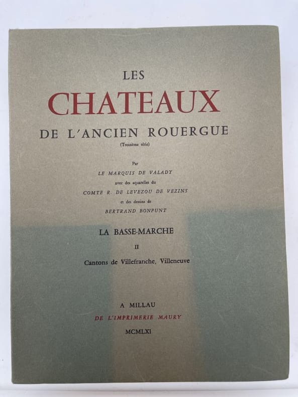 Rouergue Rodez Imprimerie Carrère 1961, grand et très fort In-4 broché, couverture à rabats. 598 pages non coupées. Index des noms propres. Aquarelle du Comte R. R. de Levezou de Vezins : "Cajarc et son cjhateau" et "Campmas Saint Rémy, chateau" et 17 dessins de Bertrand Bompunt sous serpentes légendées. Tiré à 530 exemplaires. Exemplaire numéroté sur Alfa. 3e et dernier volume paru couvrant les cantons de Villefranche de Rouergue et Villeneuve d'Aveyron. Légère décoloration par insolation au premier plat sans aucune gravité. Très bel état. Rare et recherché.