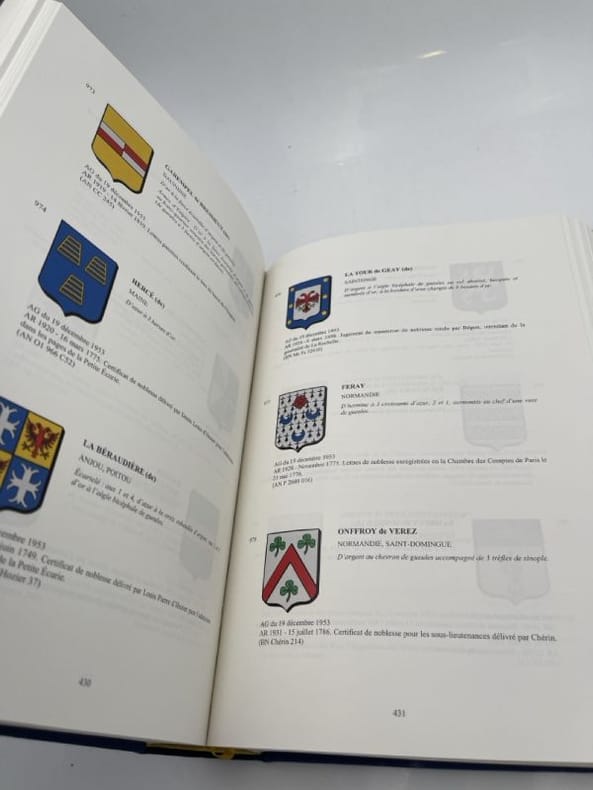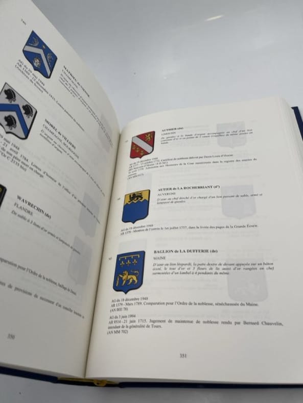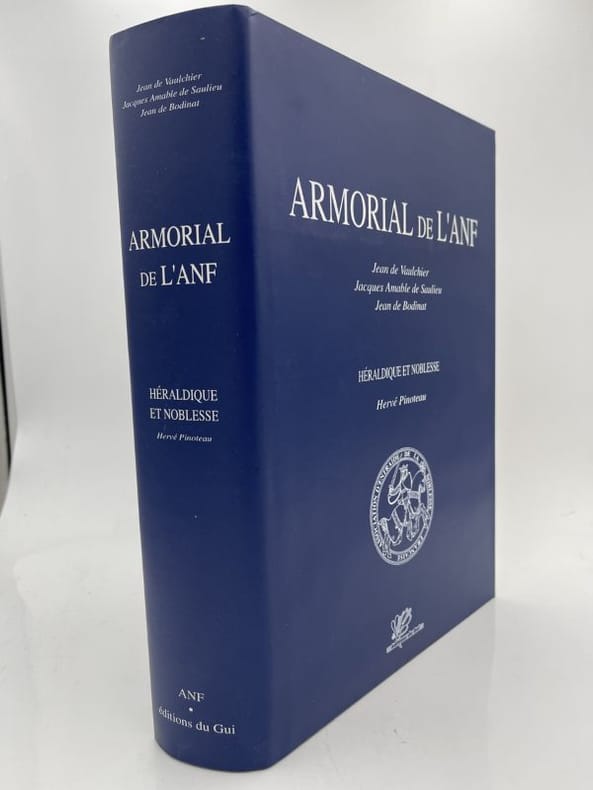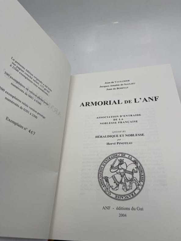 ANF - Editions du Gui ANF, Editions du Gui, 2004. Grnad In-4 relié pleine toile bleue éditeur sous jaquette de 854 pages ornées de 2244 blasons couleurs expliqués. Table alphabétique des familles avec renvoi au numéro de l'Armorial en fin. Tirage limité numéroté, celui-ci exemplaire relié version prestige n°467. Parfait état