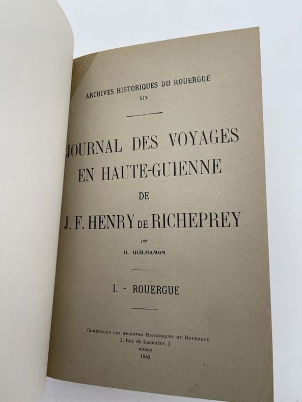 Rouergue Rodez, Commission des Archives Historiques du Rouergue, 1952. Grand et fort In-8 relié demi basane blonde, dos à nerfs, filets, fleurons et guirlande dorés, couverture conservée, gardes de papier marbré. lxxxvi + 479 pages, index, carte dépliante. Ouvrage du plus grand intêrèt, véritable état des lieux du Rouergue à la veille de la Révolution. Renseignements multiples touchant a peu près tous les secteurs de l'activité humaine. J.F. HENRY DE RICHEPREY avait été envoyé en Guyenne pour en inspecter les cadastres et en ordonner, le cas échéant, la réfection. Une mine de renseignements pour les recherches d'histoire sociale et agraire. Tirage limité à 300 exemplaires. Exemplaire très bien relié, en très belle condition. Rare.